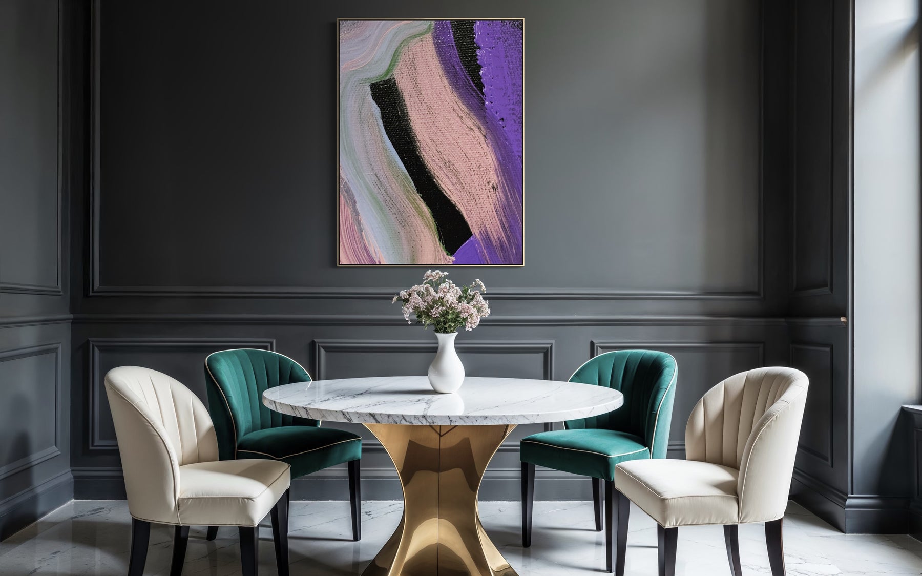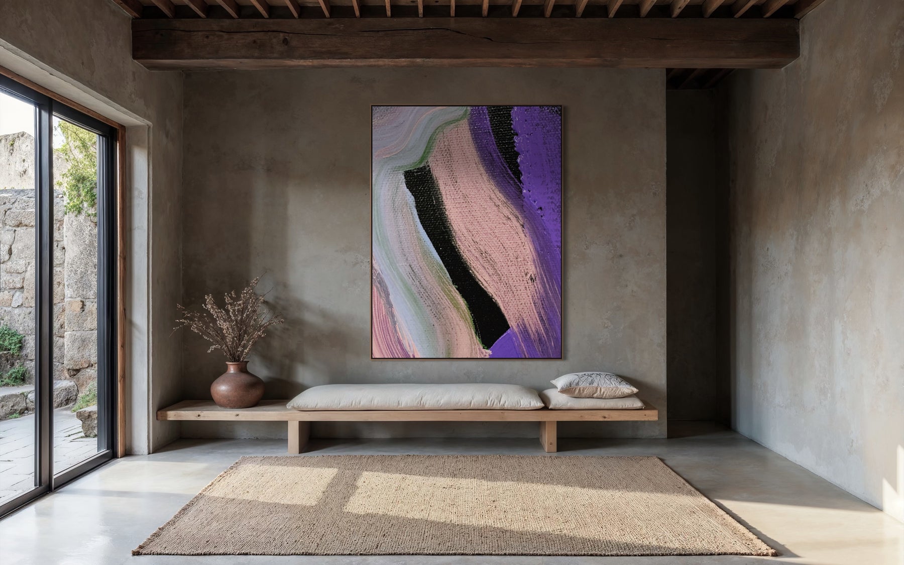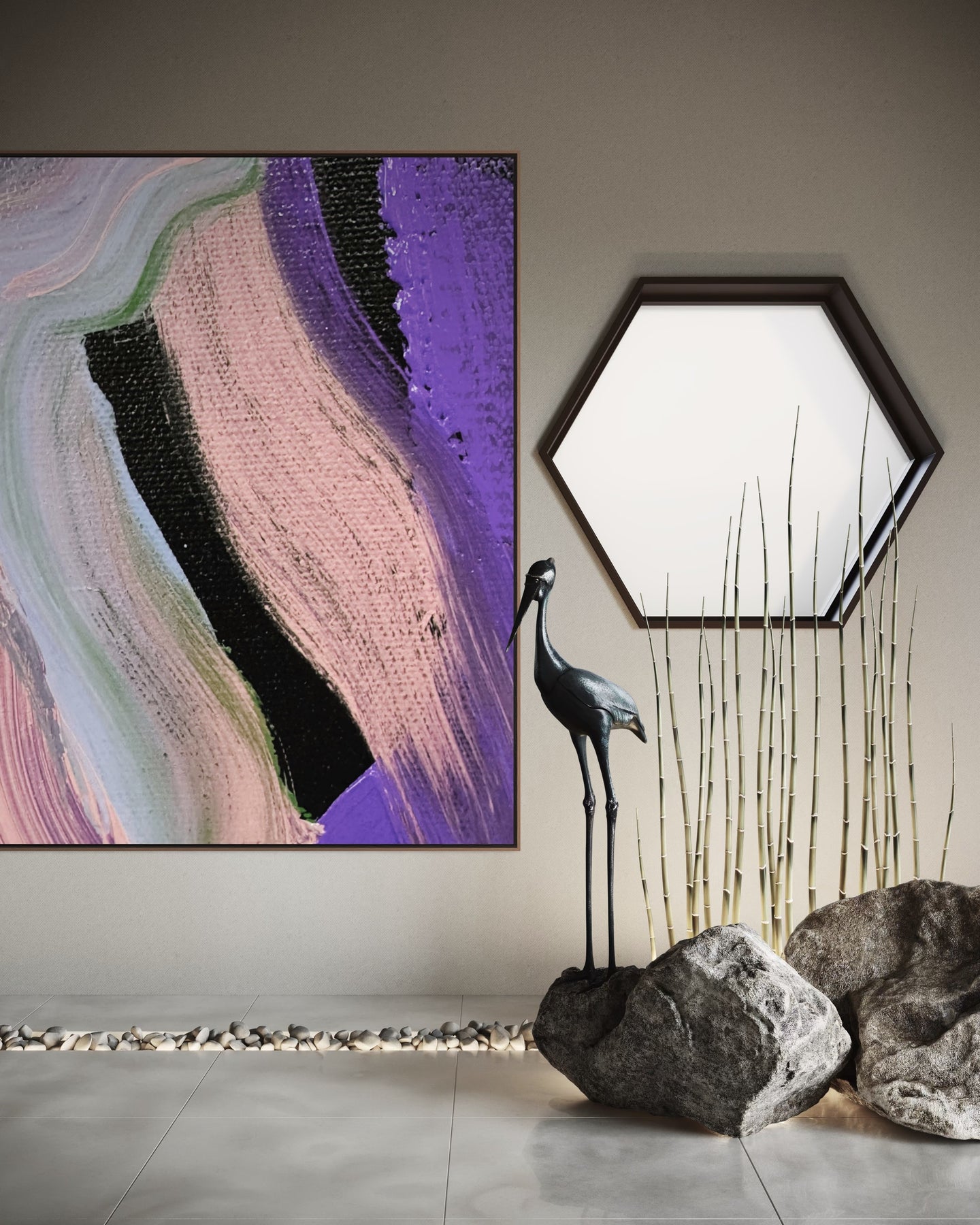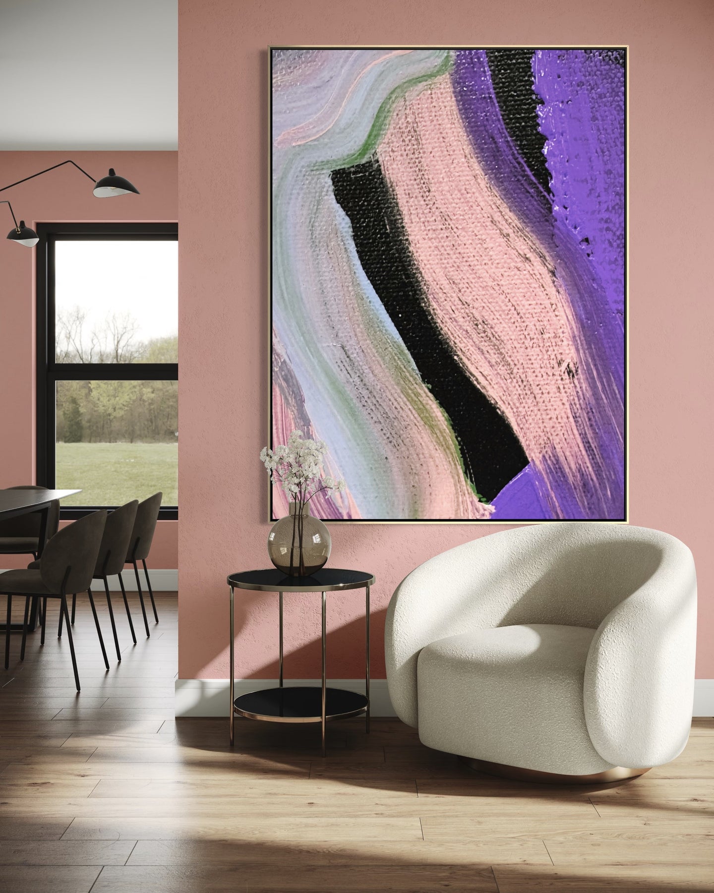 This expressive abstract painting explores the quiet movement of emotion and reflection. Flowing strokes of purple, blush, and soft green move across layered textures, creating a sense of depth, balance, and calm presence. The composition reflects the gentle rhythm between motion and stillness, where color and form unfold with time. Created for collectors drawn to layered color relationships and contemplative abstraction, this piece brings sophistication and serenity to contemporary interiors.