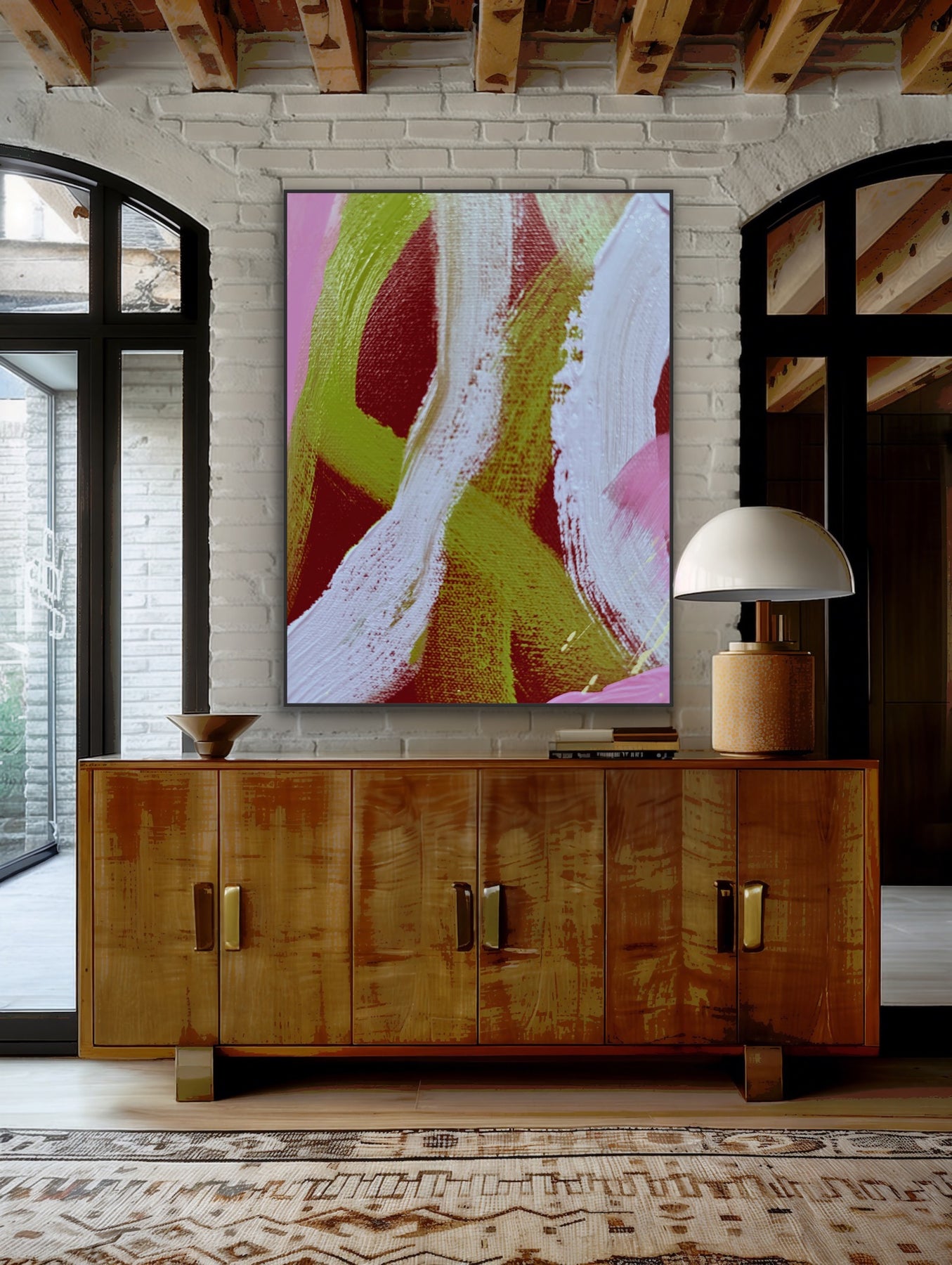The painting reflects the quiet space where connection deepens — expressive yet gentle, powerful yet intimate. Created for collectors drawn to romantic color relationships and modern abstraction, this piece brings warmth and emotional presence to contemporary interiors.