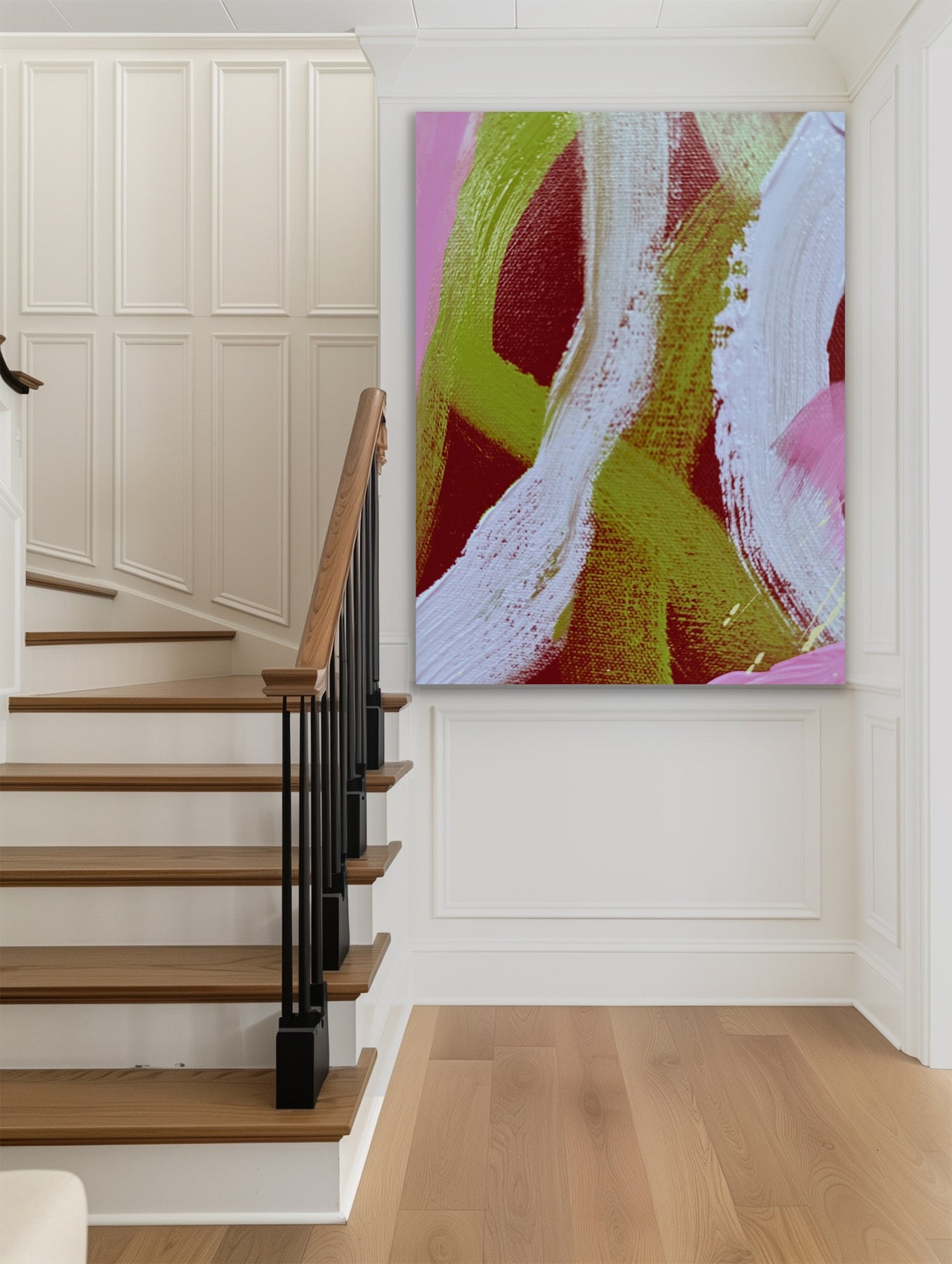 This expressive abstract painting explores intimacy and emotional closeness through bold color and layered movement. Warm red tones create a passionate foundation while sweeping white and soft pink strokes bring balance and tenderness to the composition.