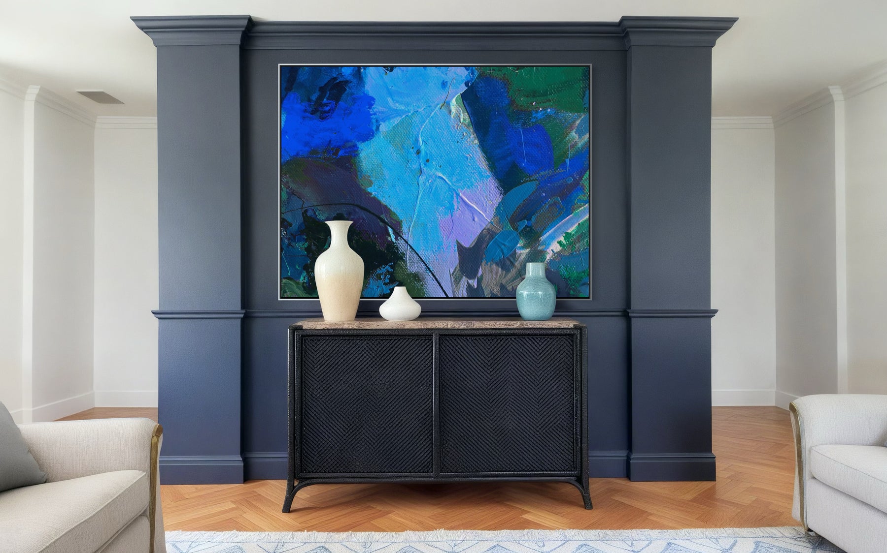 All frames are custom-built in-house and painted to complement your selected finish. Frames are installed after the artwork is completed and include professional hanging wires for immediate display.