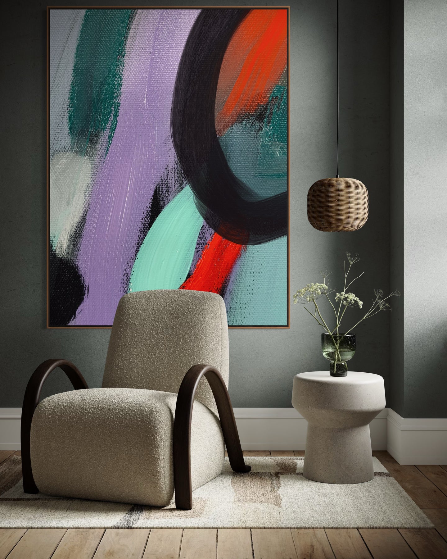 "Mystical Fusion" is an abstract painting that exudes a sense of enchantment and mystery. The artwork features a harmonious blend of deep purples, and vibrant red interwoven with splashes of shades green. The dynamic brushstrokes create a swirling motion that pulse with energy and life.