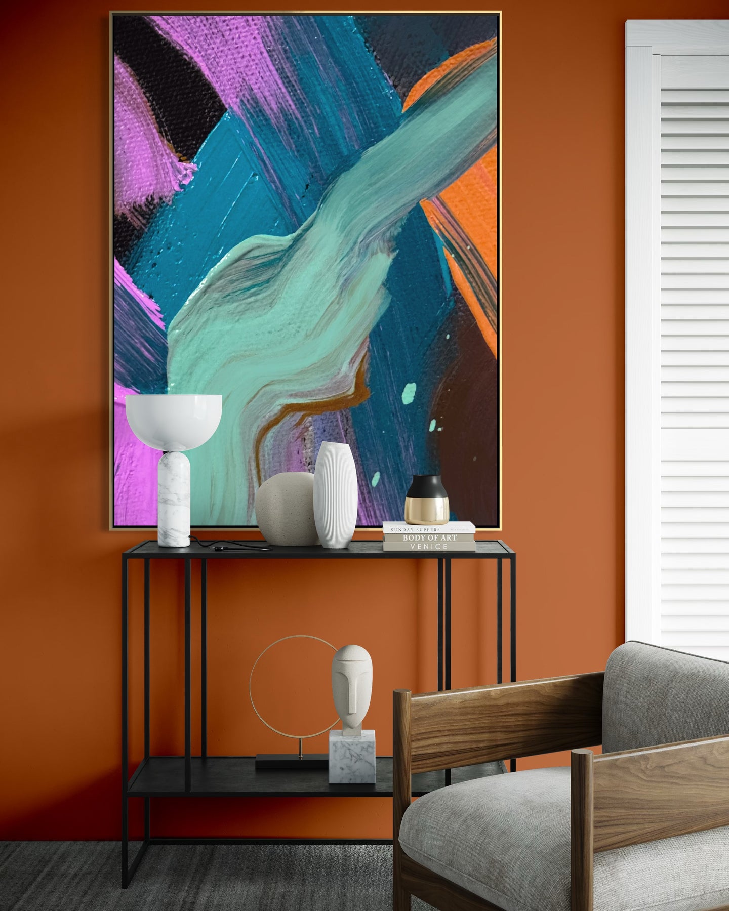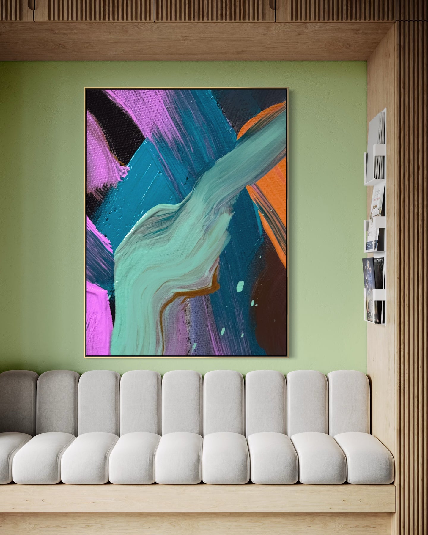 This expressive abstract painting captures a moment of movement through layered color and sweeping brushwork. A flowing mint-toned stroke moves across deep blues, purples, and vibrant accents, creating a composition that feels dynamic and alive. The painting explores the energy of motion — where color, texture, and gesture meet. Designed for modern interiors and collectors drawn to expressive contemporary abstraction, this artwork adds movement, depth, and visual energy to any space.