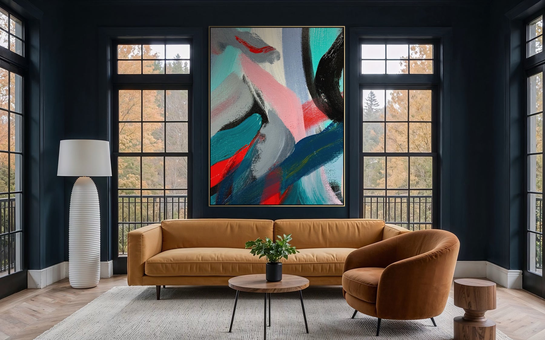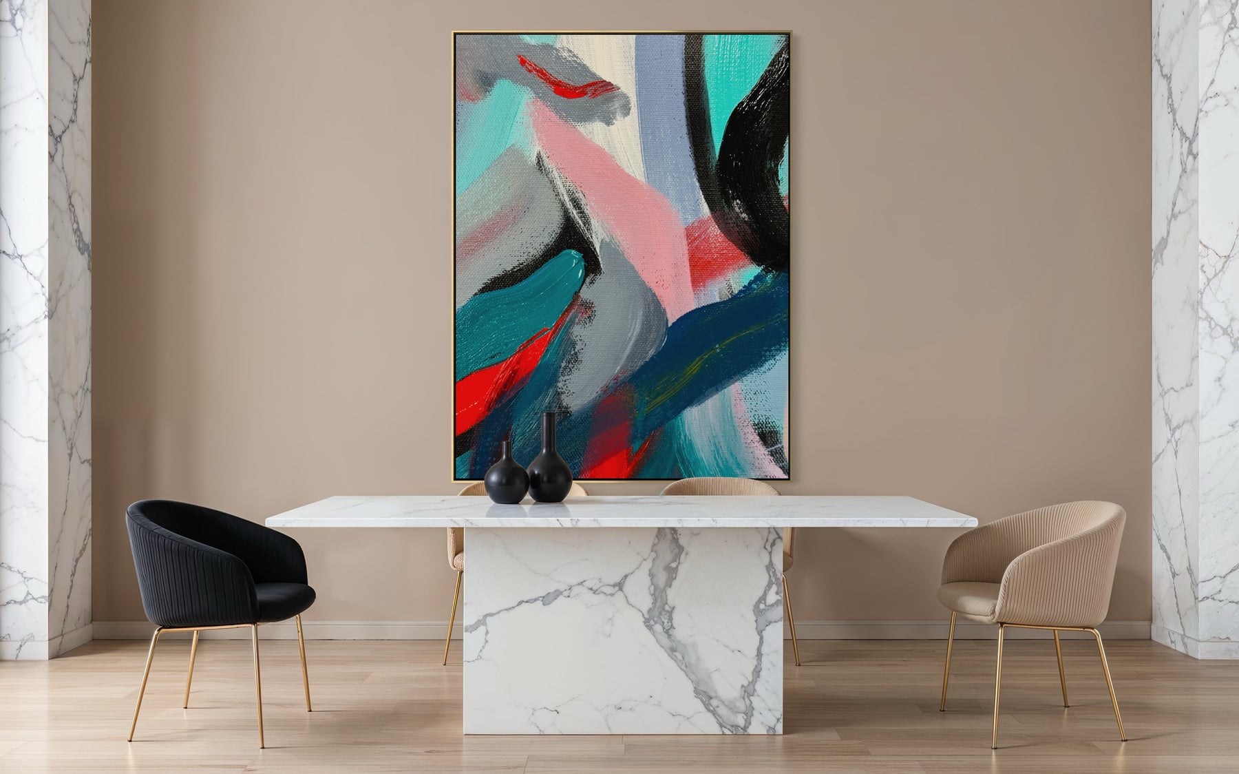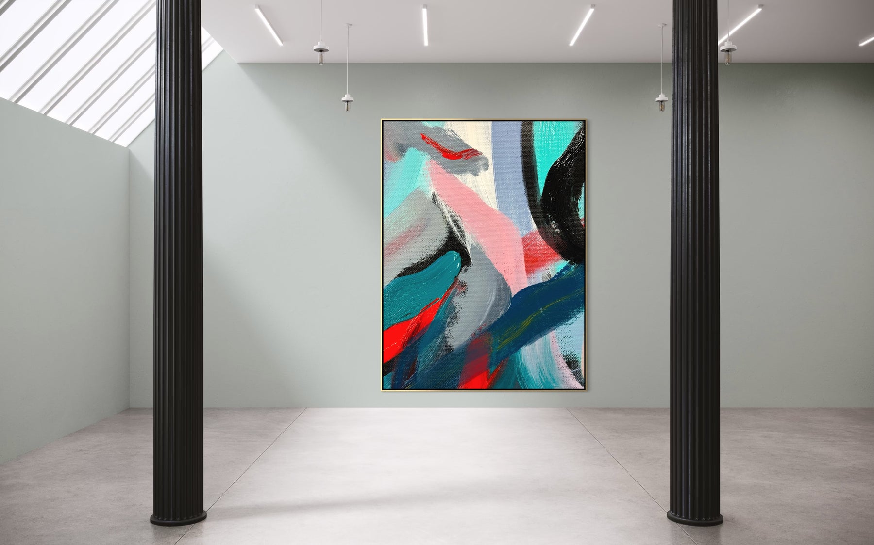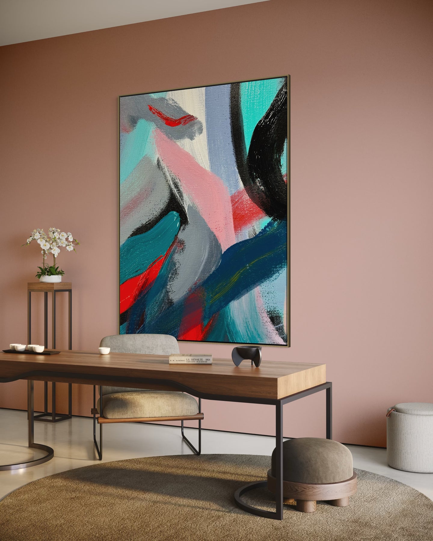 This expressive abstract painting explores the moment where different directions of energy meet and transform into movement. Layered strokes of teal, deep blue, soft pink, and vibrant red create a composition that feels both powerful and balanced.