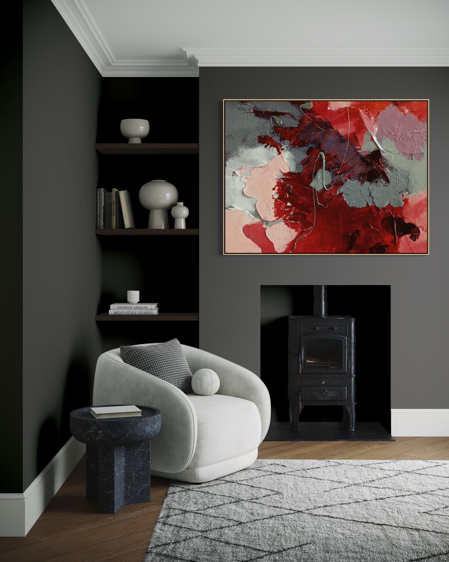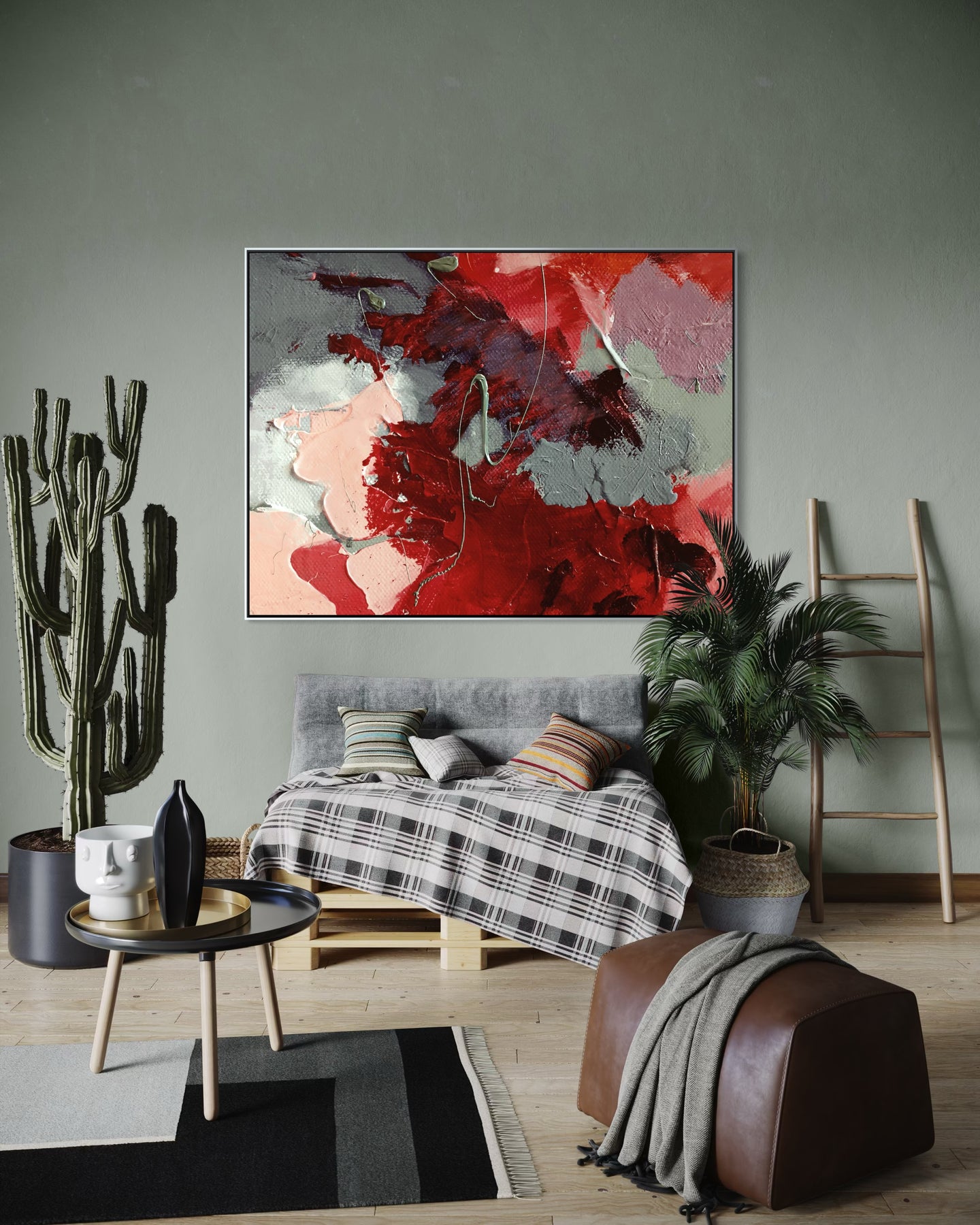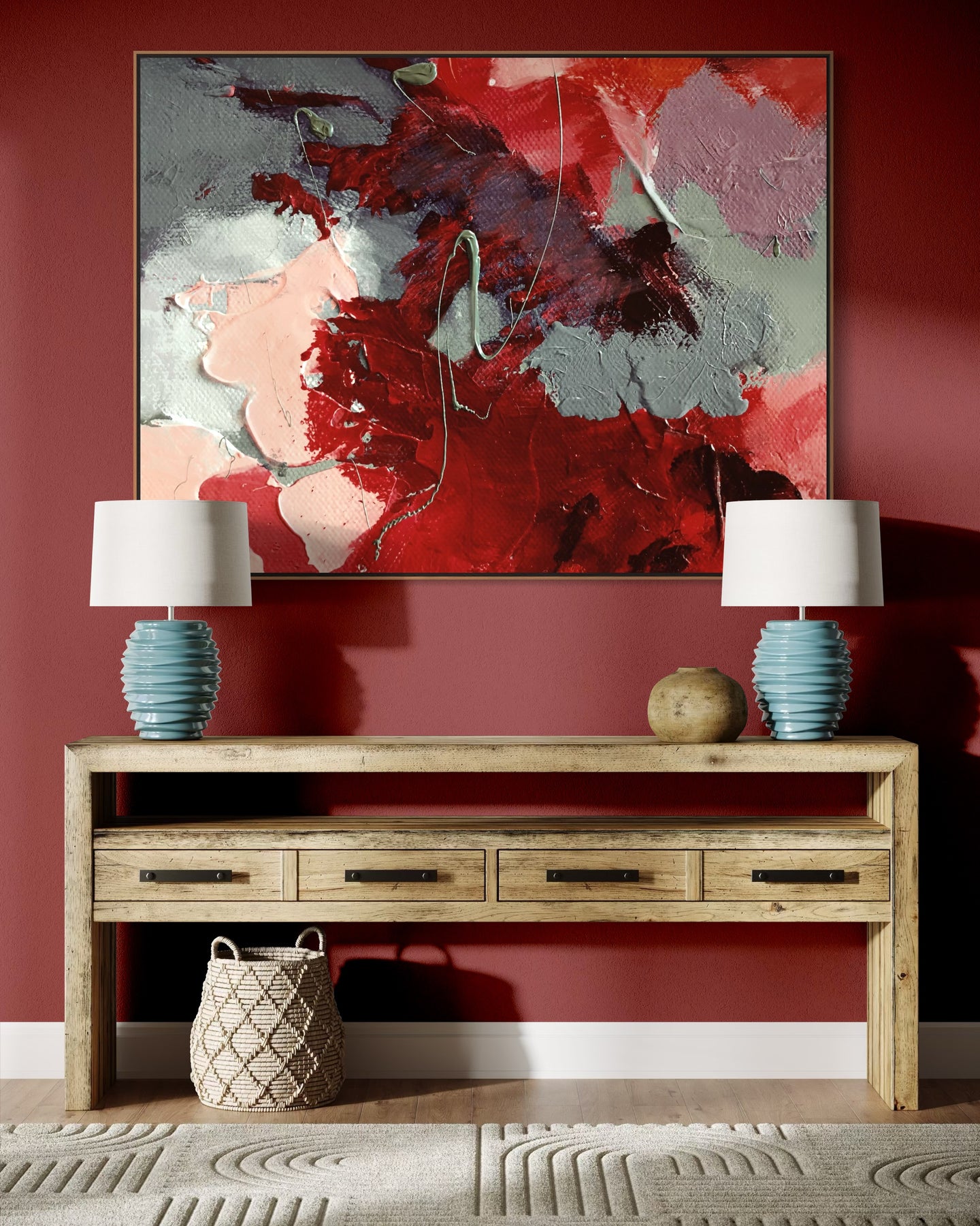 This large-scale abstract explores the intensity of emotion through bold red movement layered with soft blush and grounded gray tones. The composition reflects passion, tension, and the magnetic pull between opposing energies.