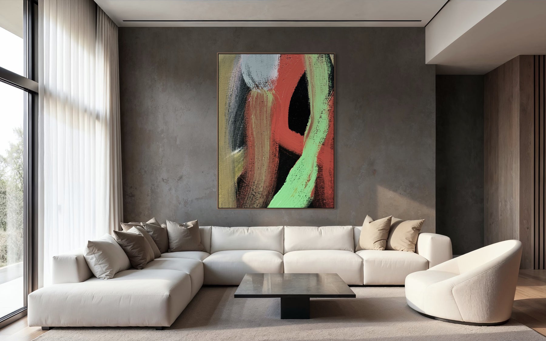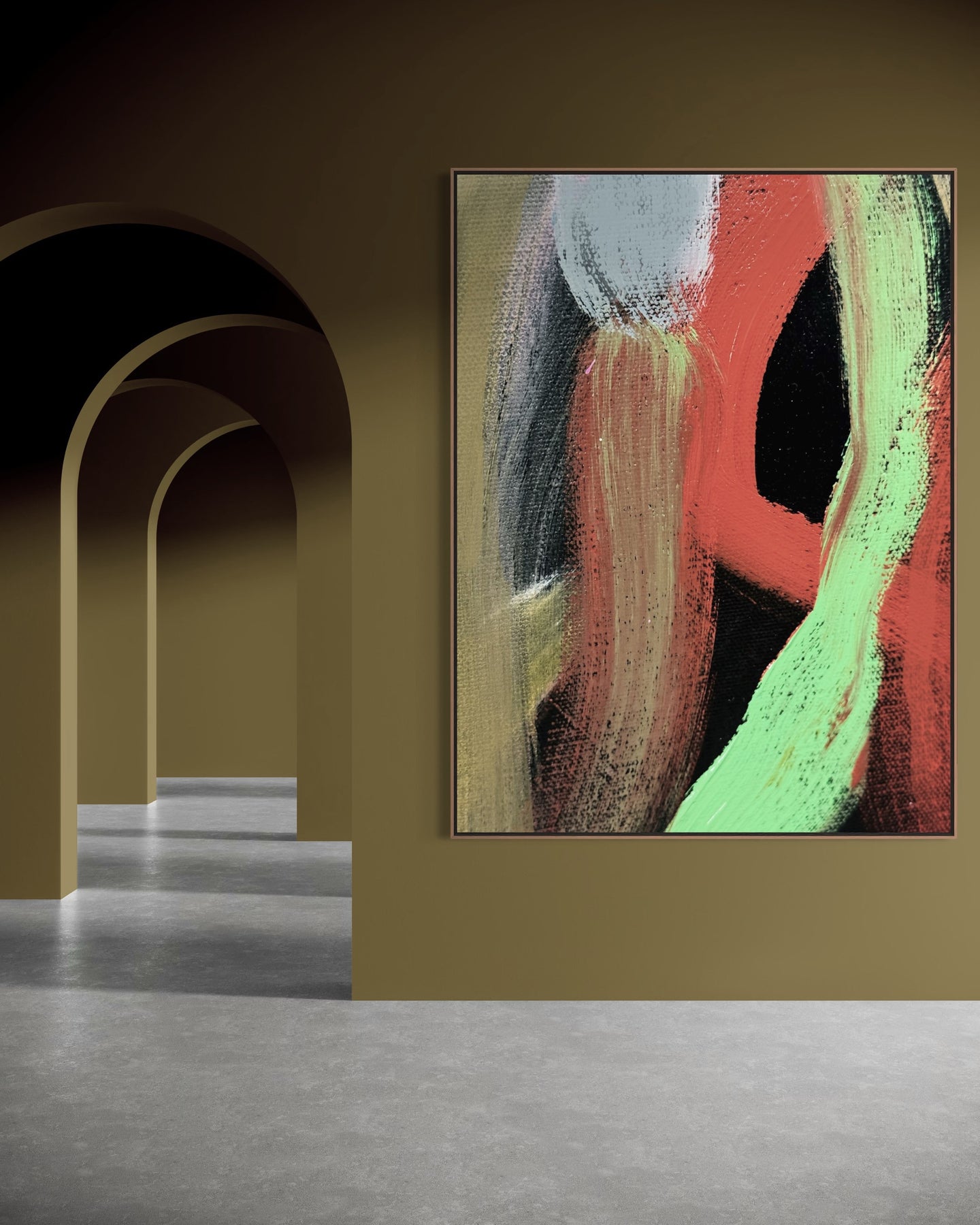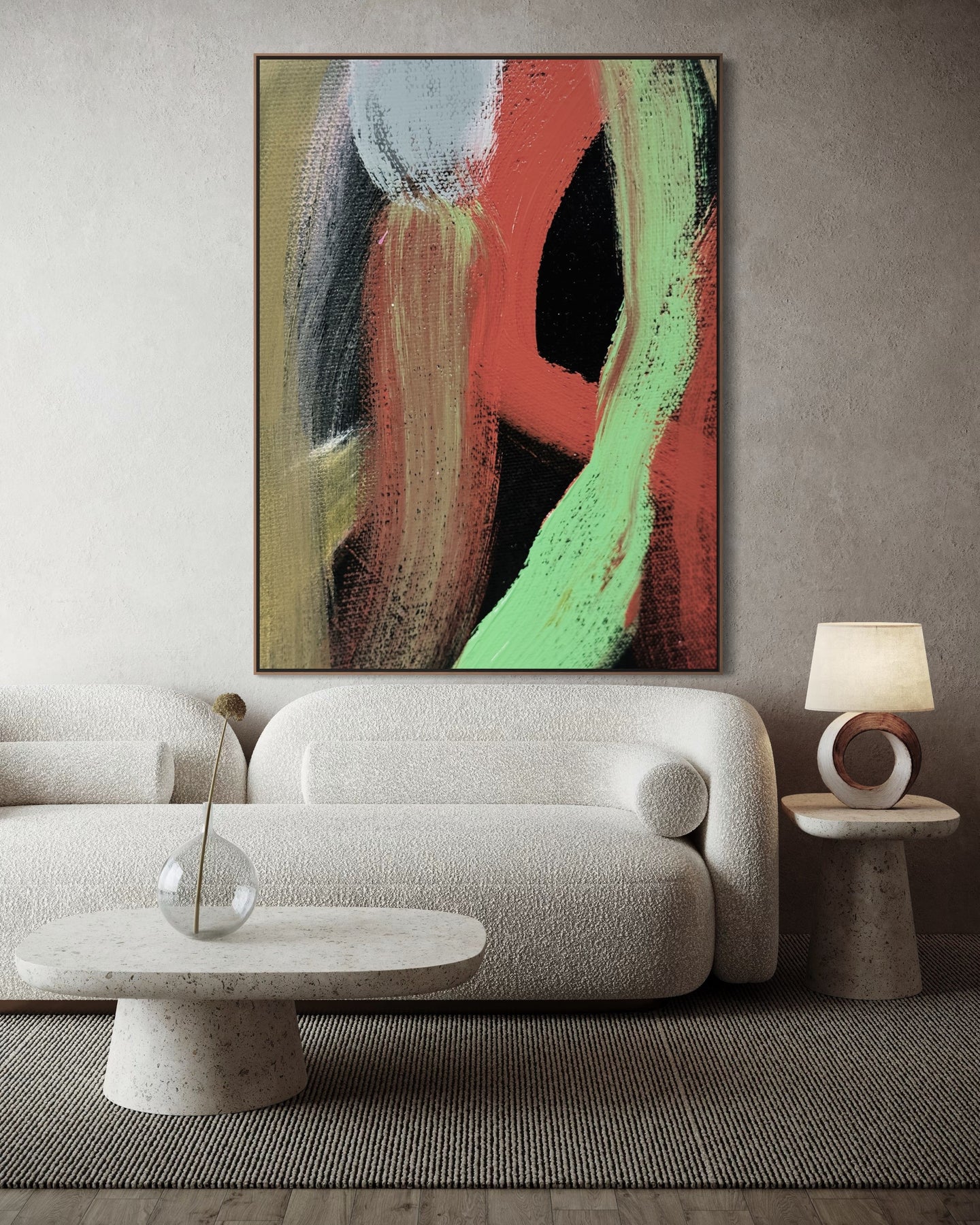 This expressive abstract painting explores attraction, tension, and the invisible forces that draw energy together. Bold strokes of vibrant red and electric green move around a deep central space, creating a sense of movement, gravity, and emotional intensity. Layered textures and sweeping brushwork give the composition both power and balance, reflecting the dynamic relationship between passion and presence. Created for collectors drawn to bold color relationships and expressive abstraction, this piece brings drama and visual energy to contemporary interiors.