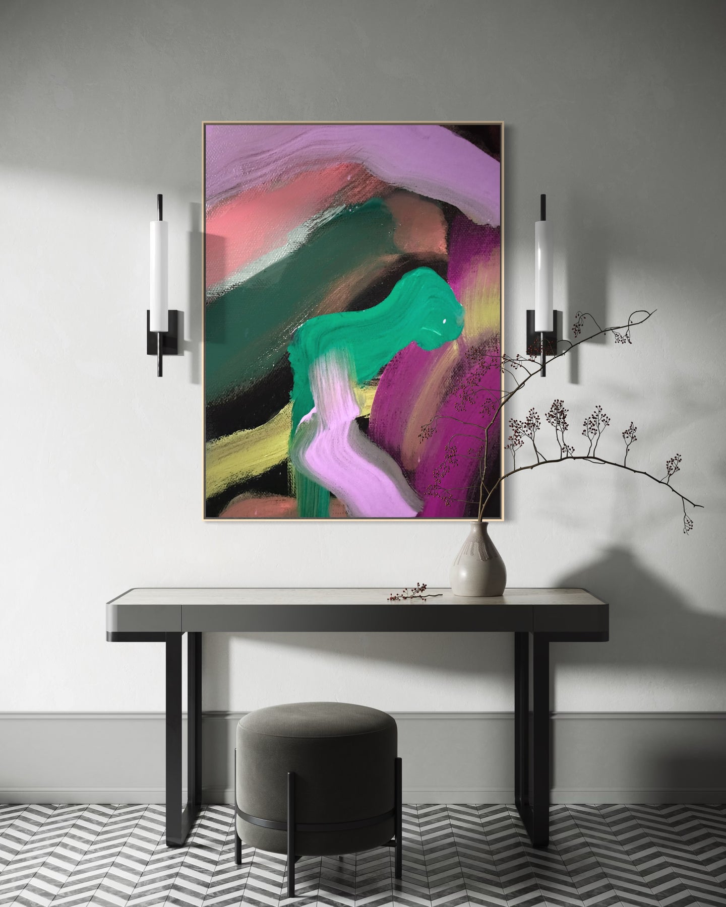 Each artwork can be completed with a handcrafted wood floating frame, designed to enhance depth while preserving the integrity of the canvas.