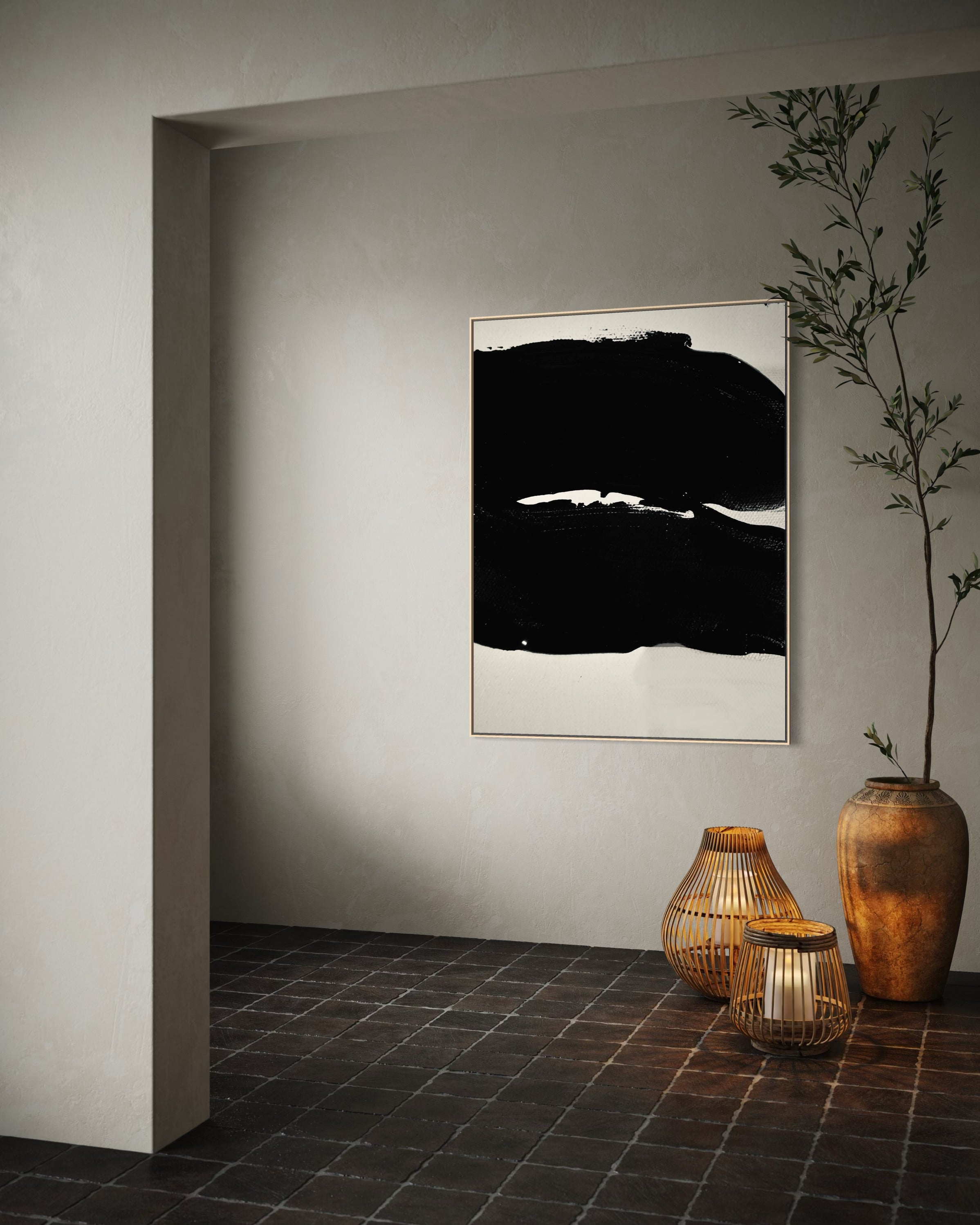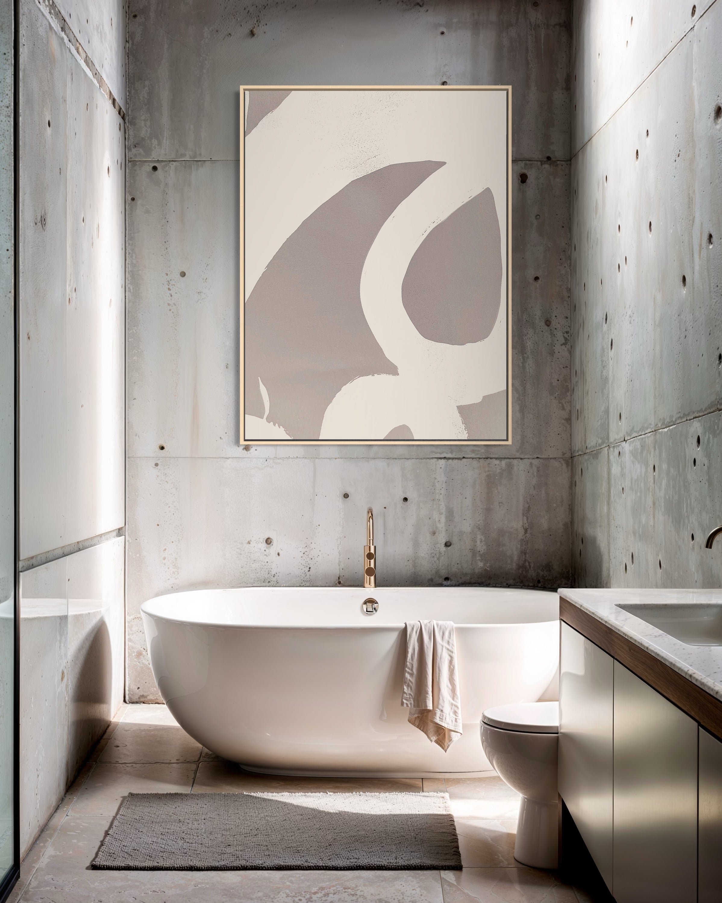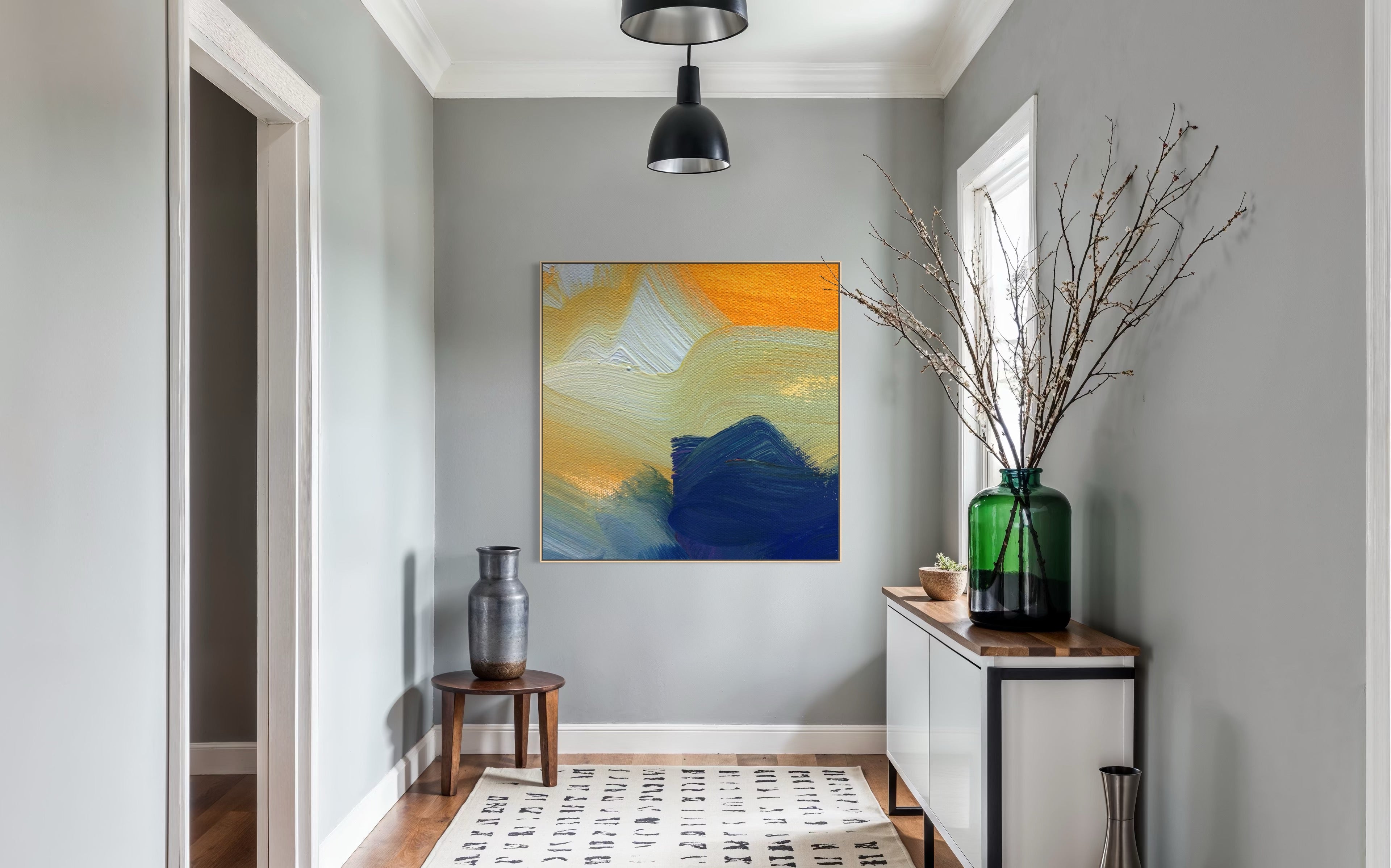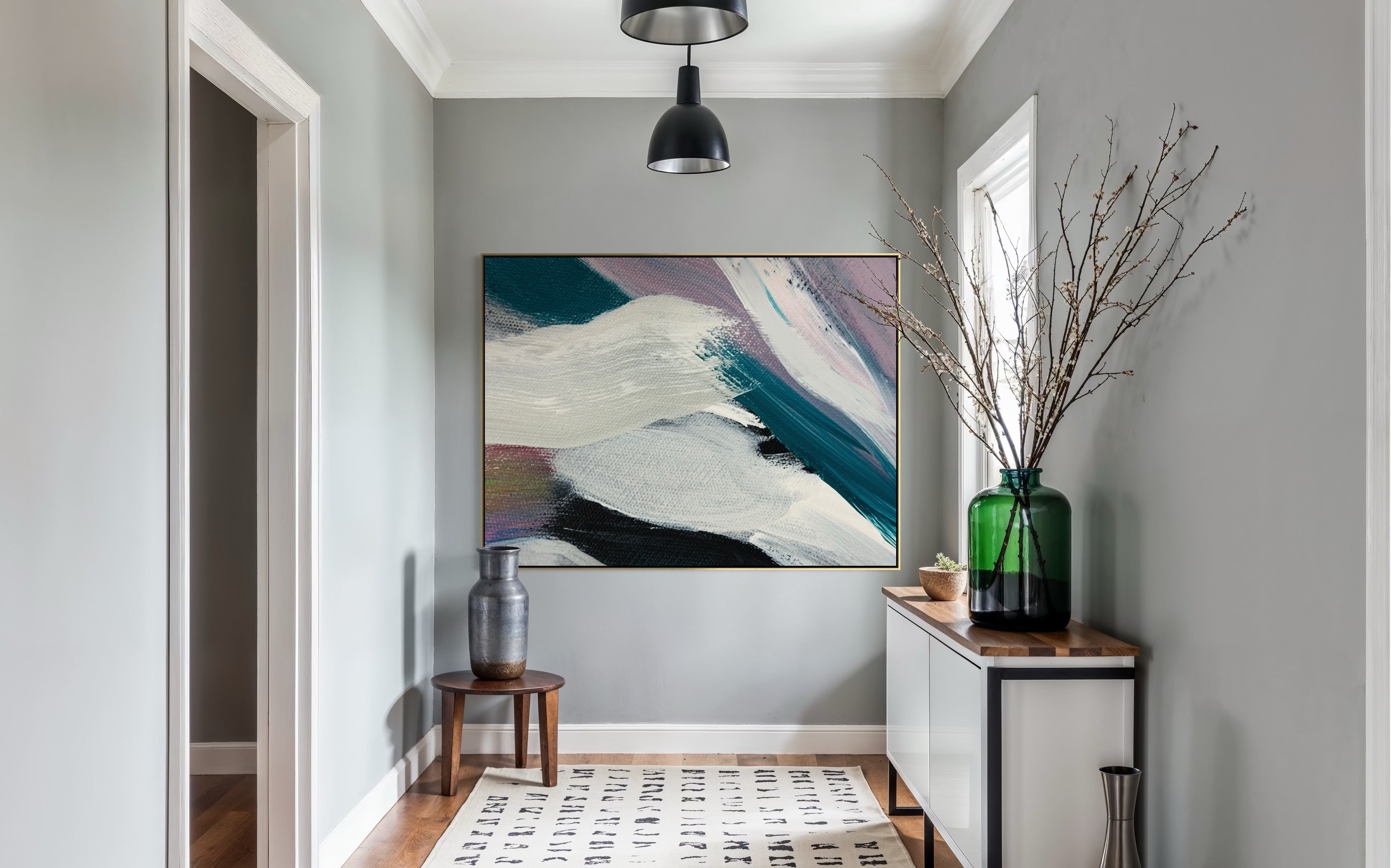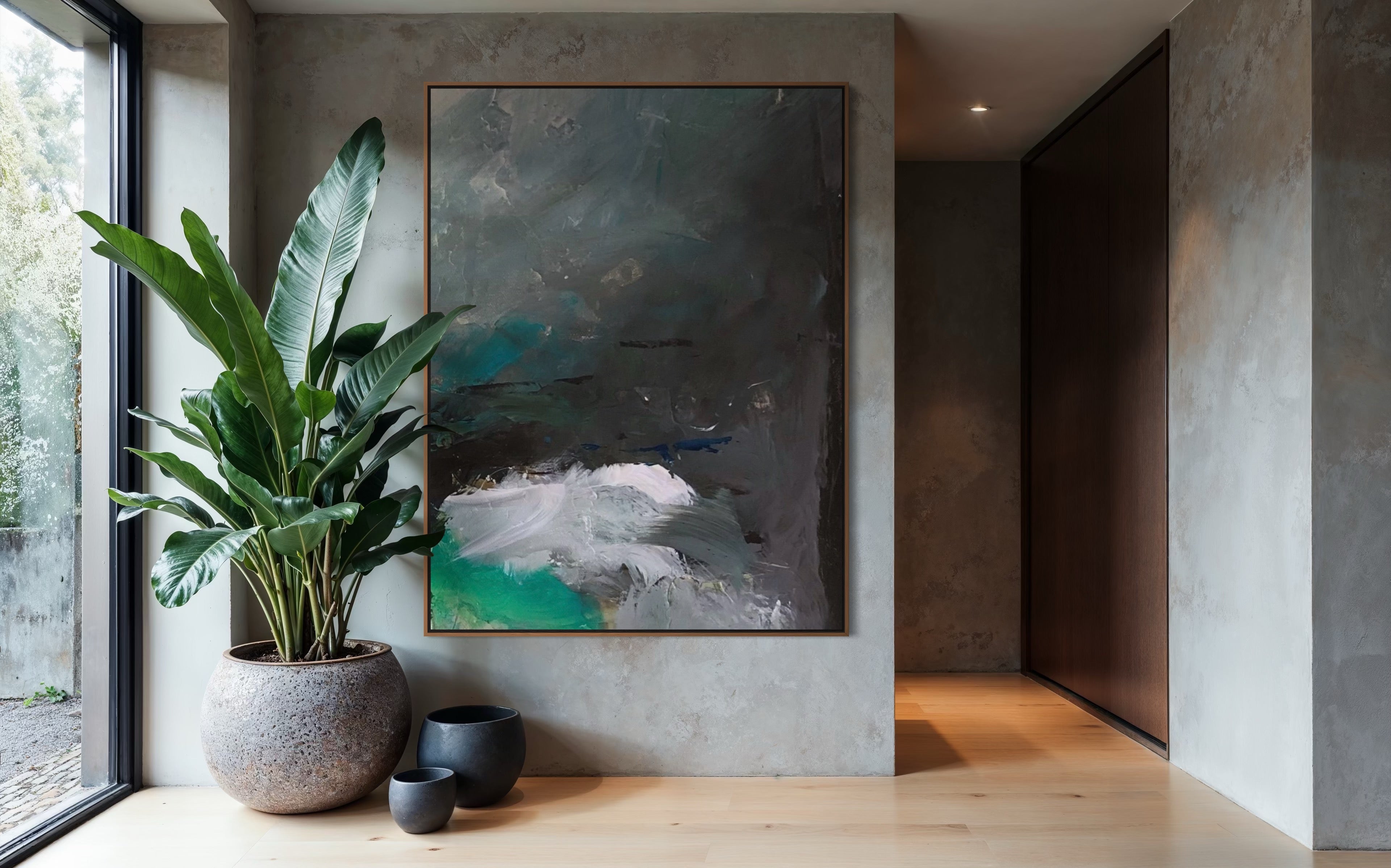 Curated artworks that balance cool greys and soft neutrals with warmth, movement, and timeless sophistication.