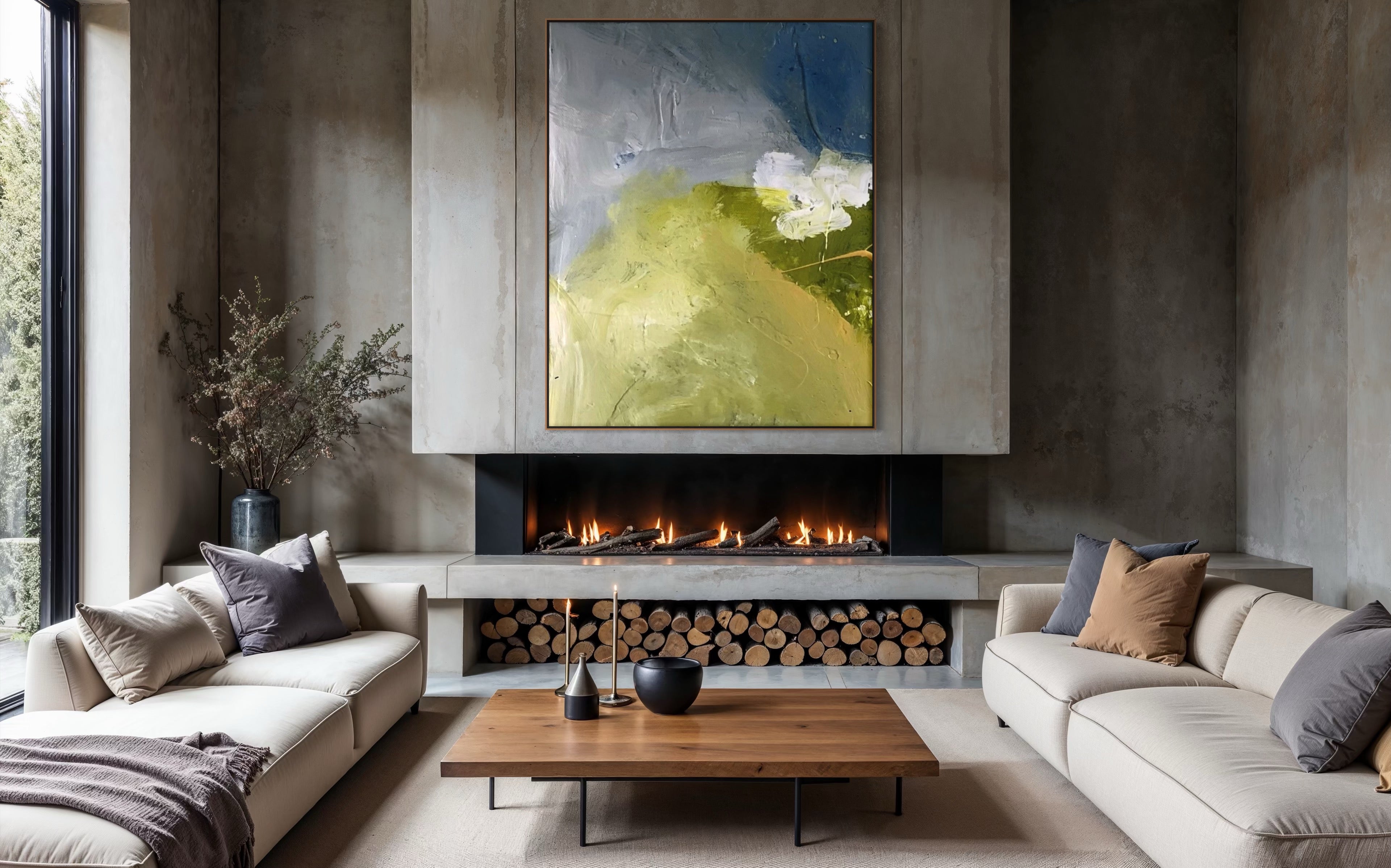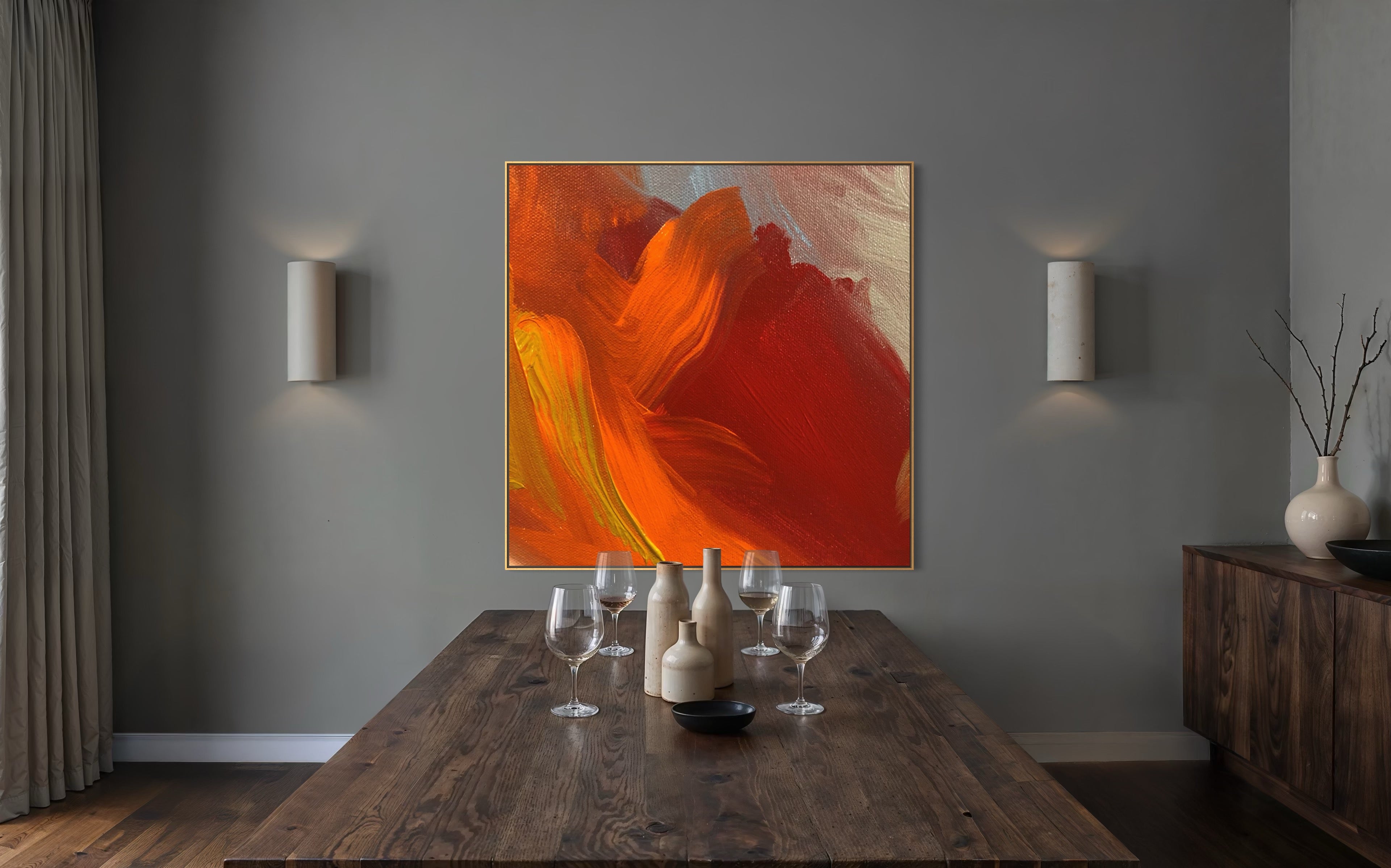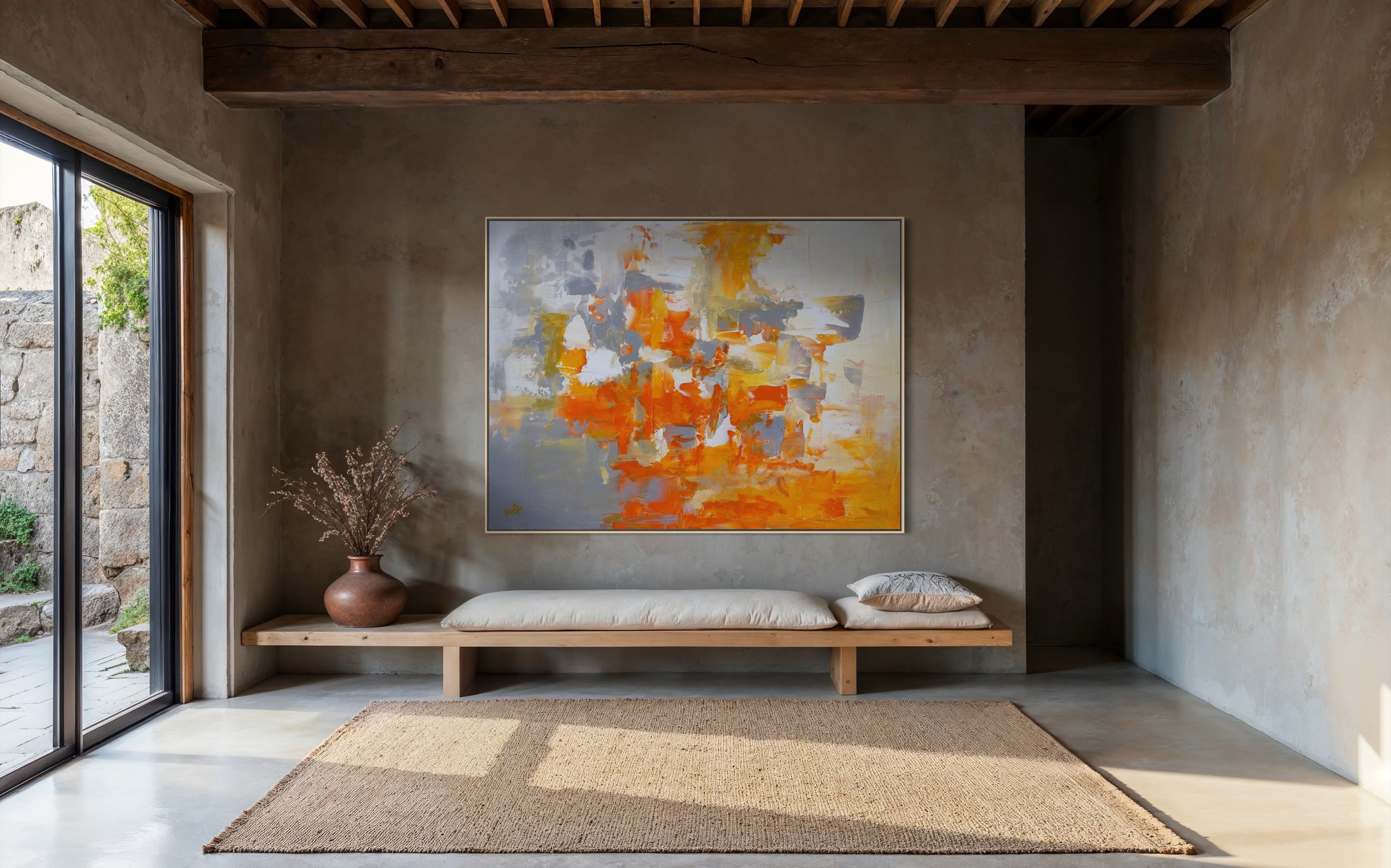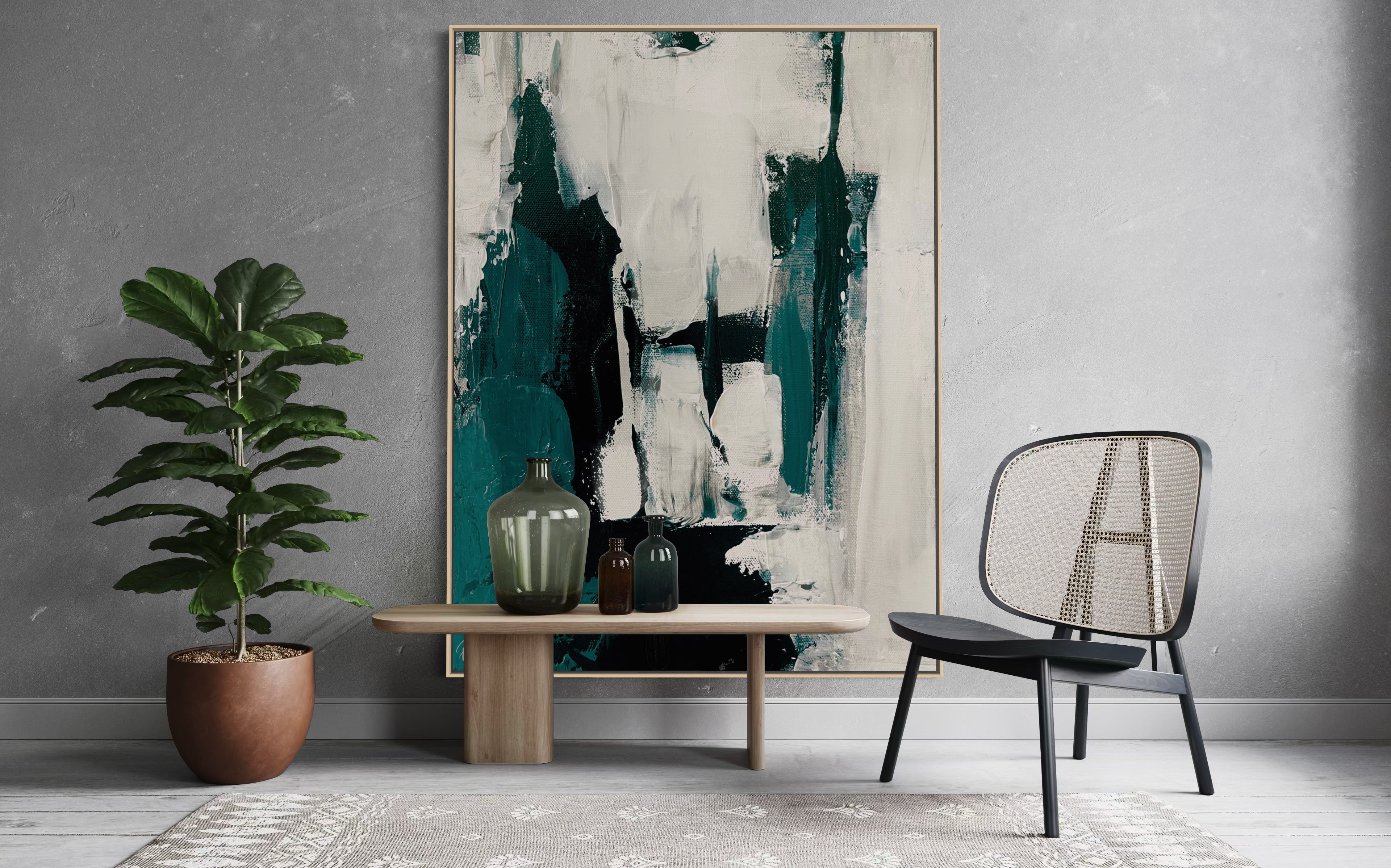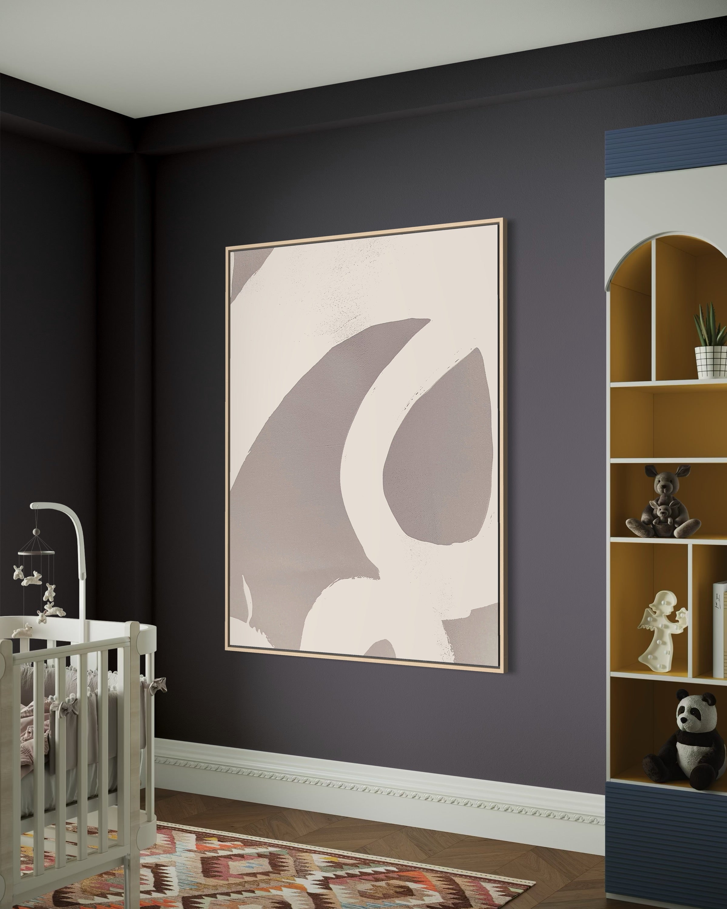 Curated artworks that balance cool greys and soft neutrals with warmth, movement, and timeless sophistication.