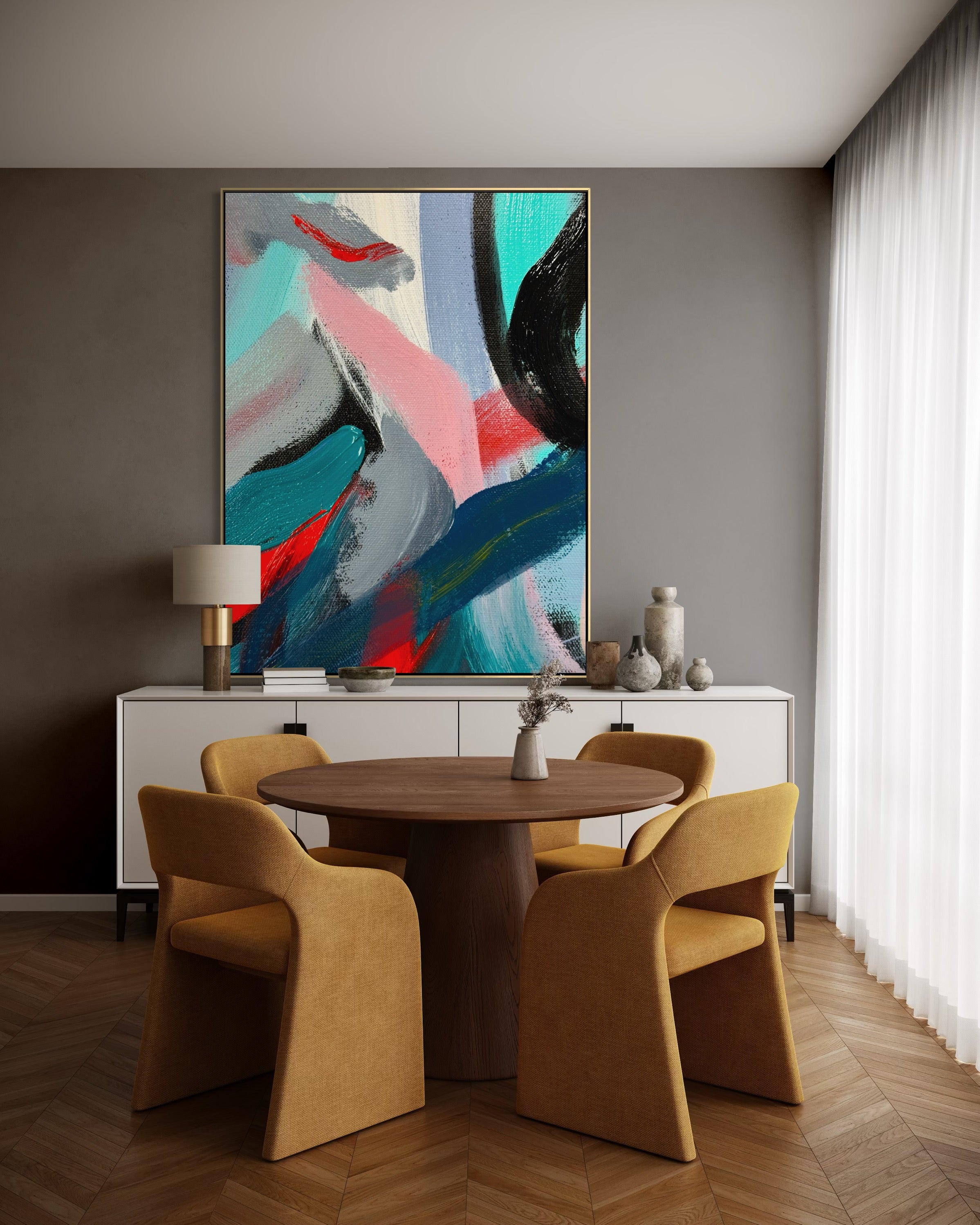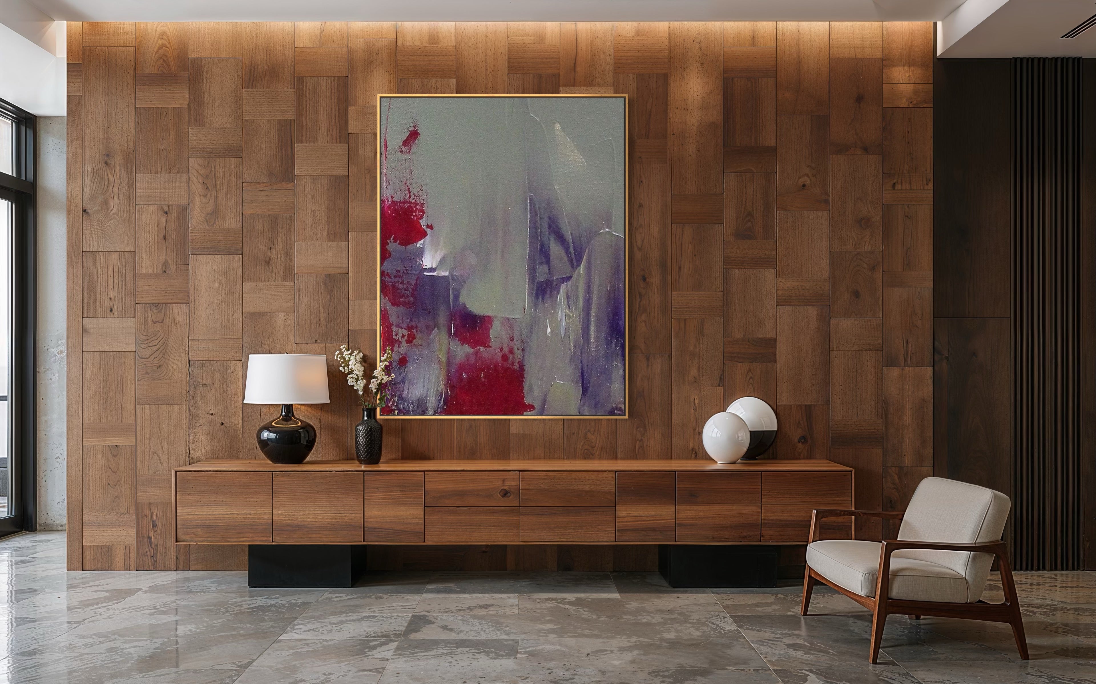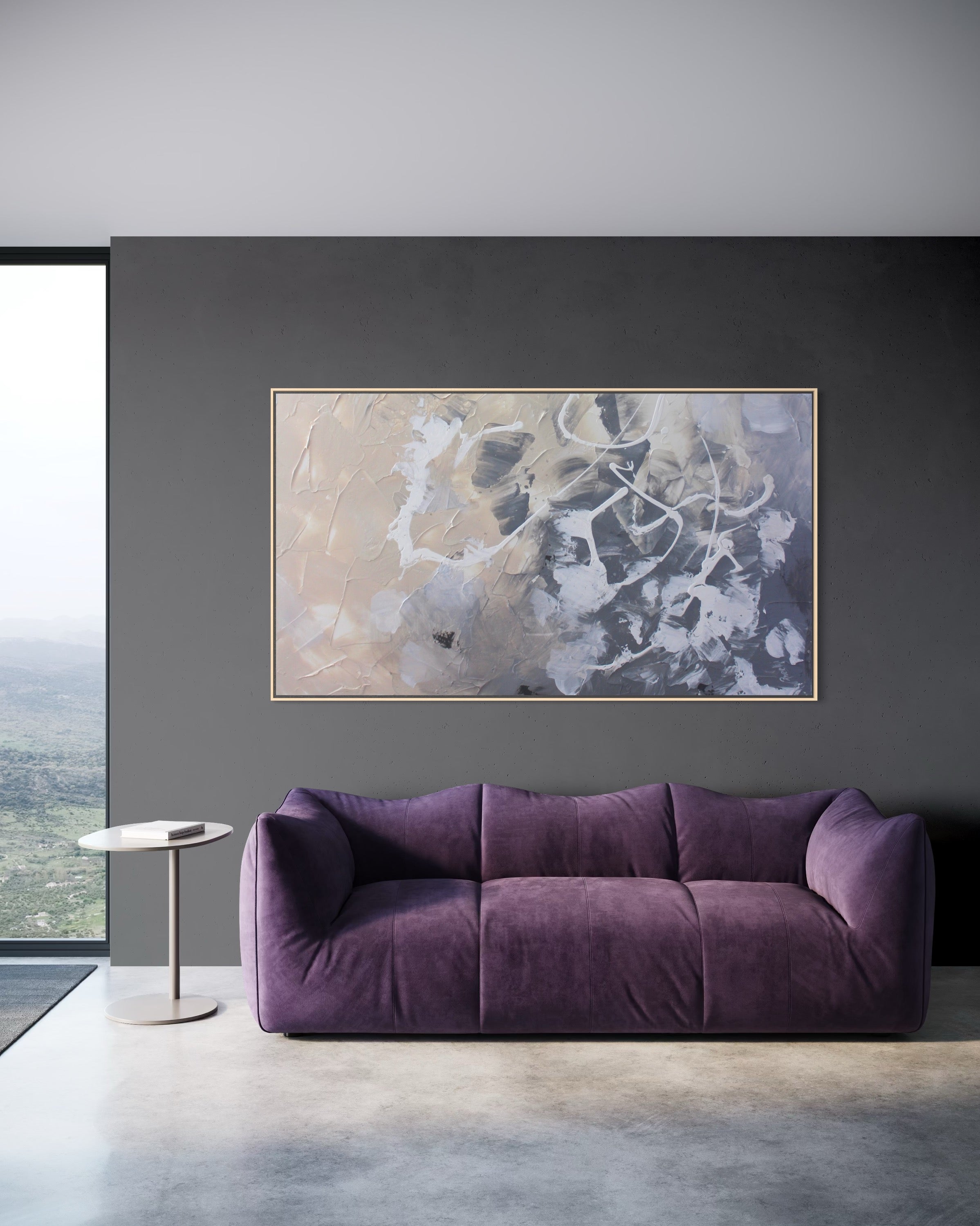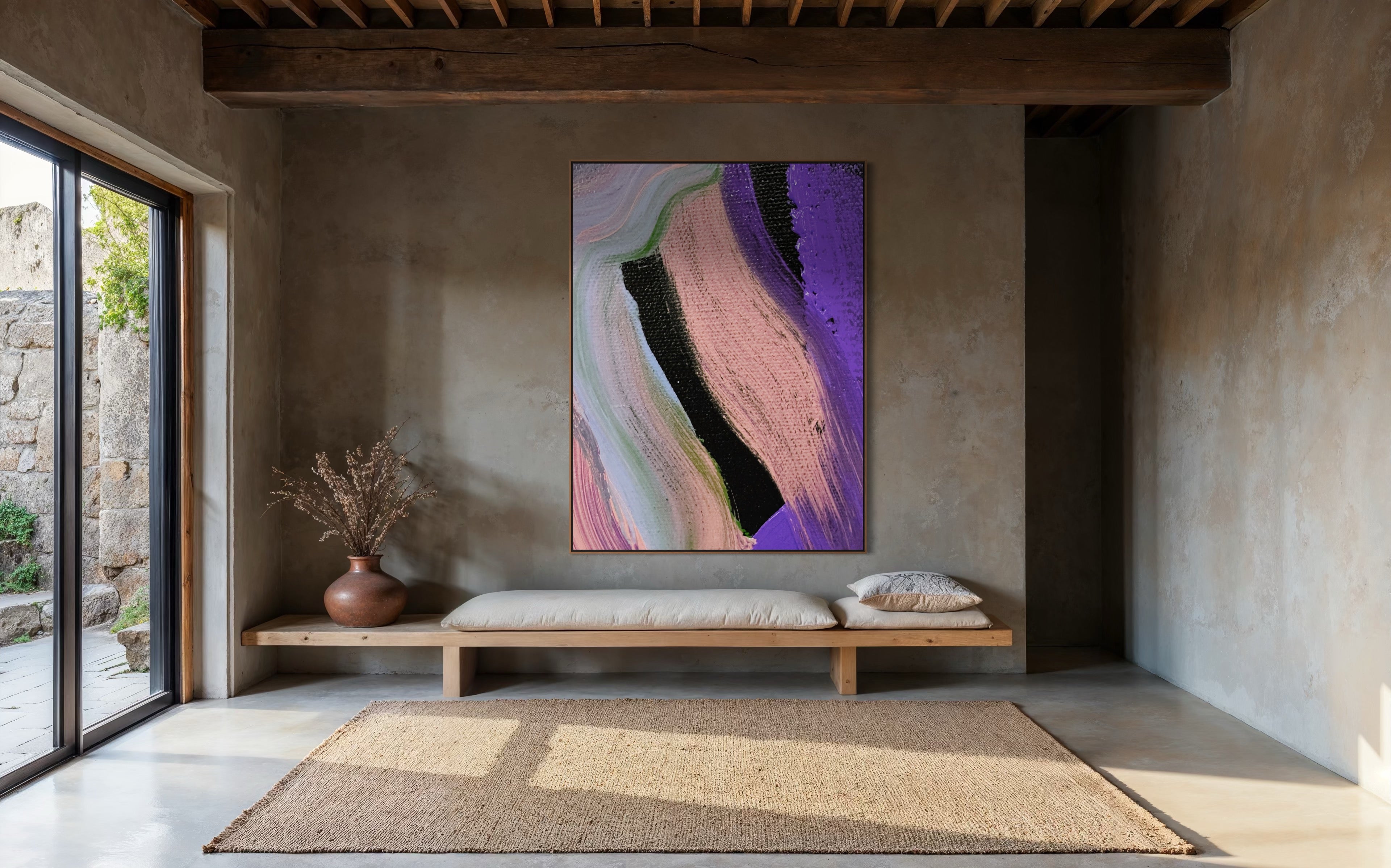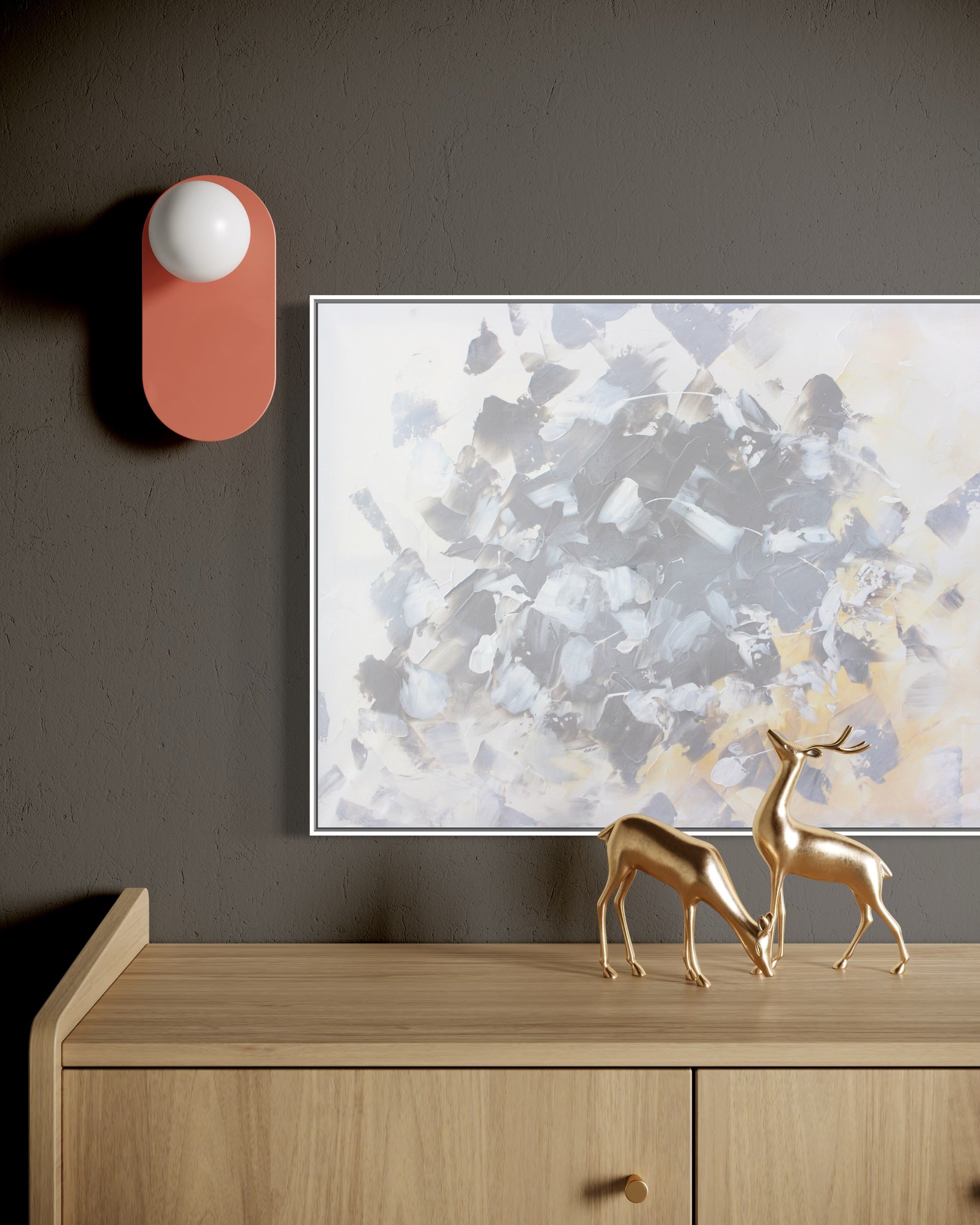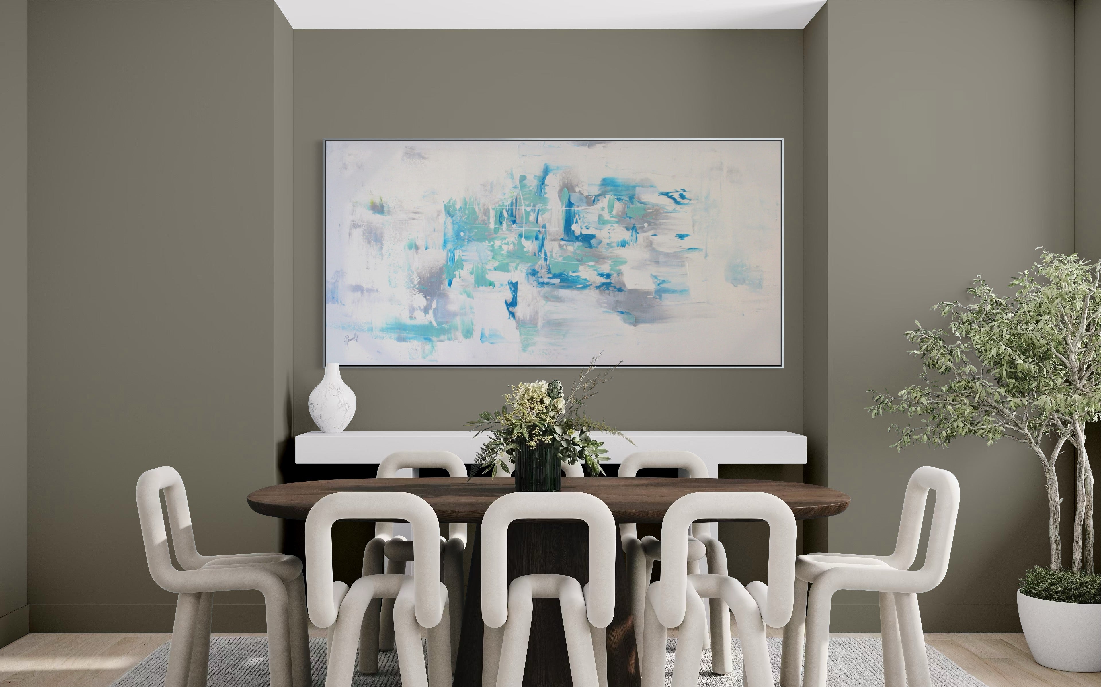 Curated artworks that balance cool greys and soft neutrals with warmth, movement, and timeless sophistication.