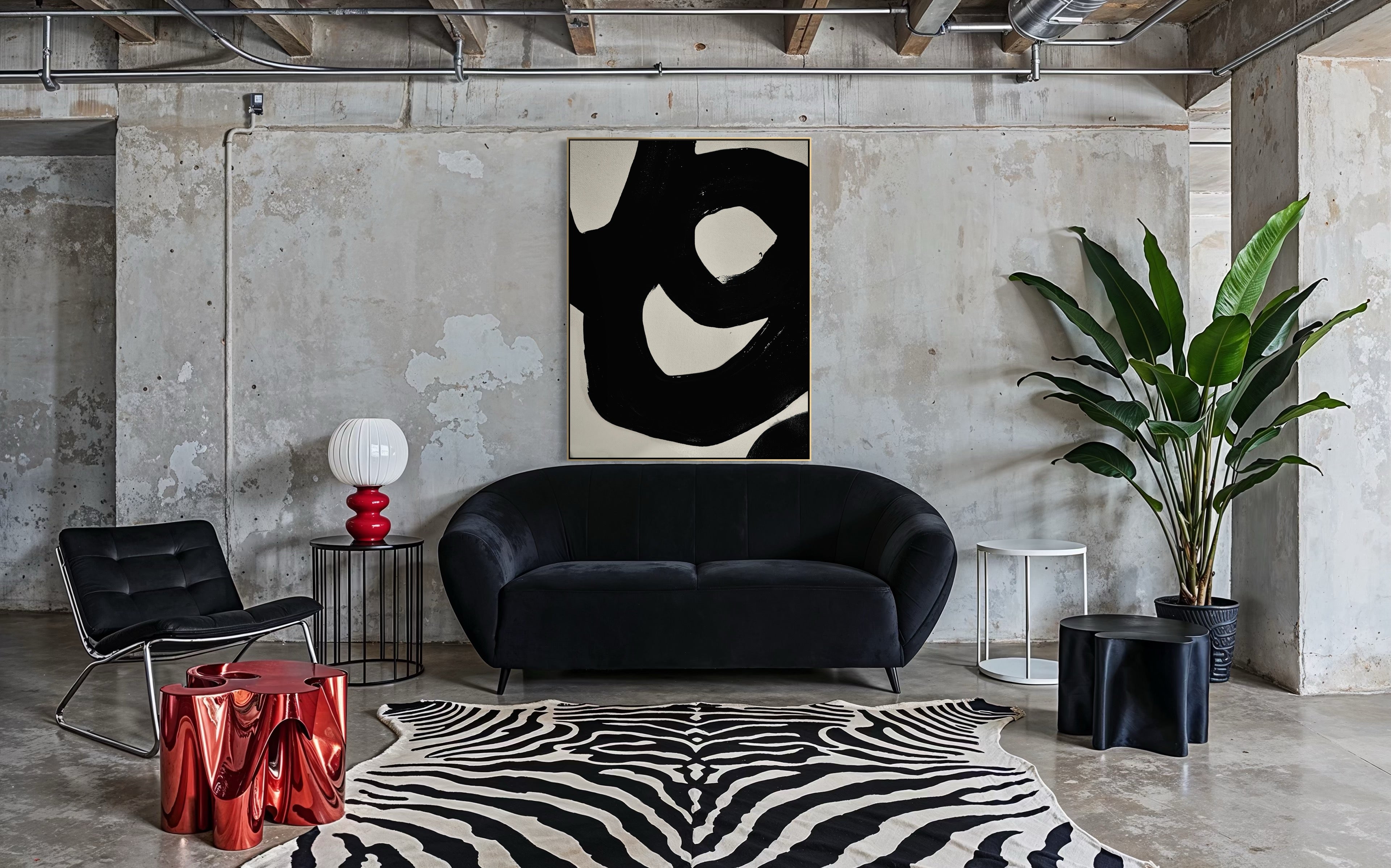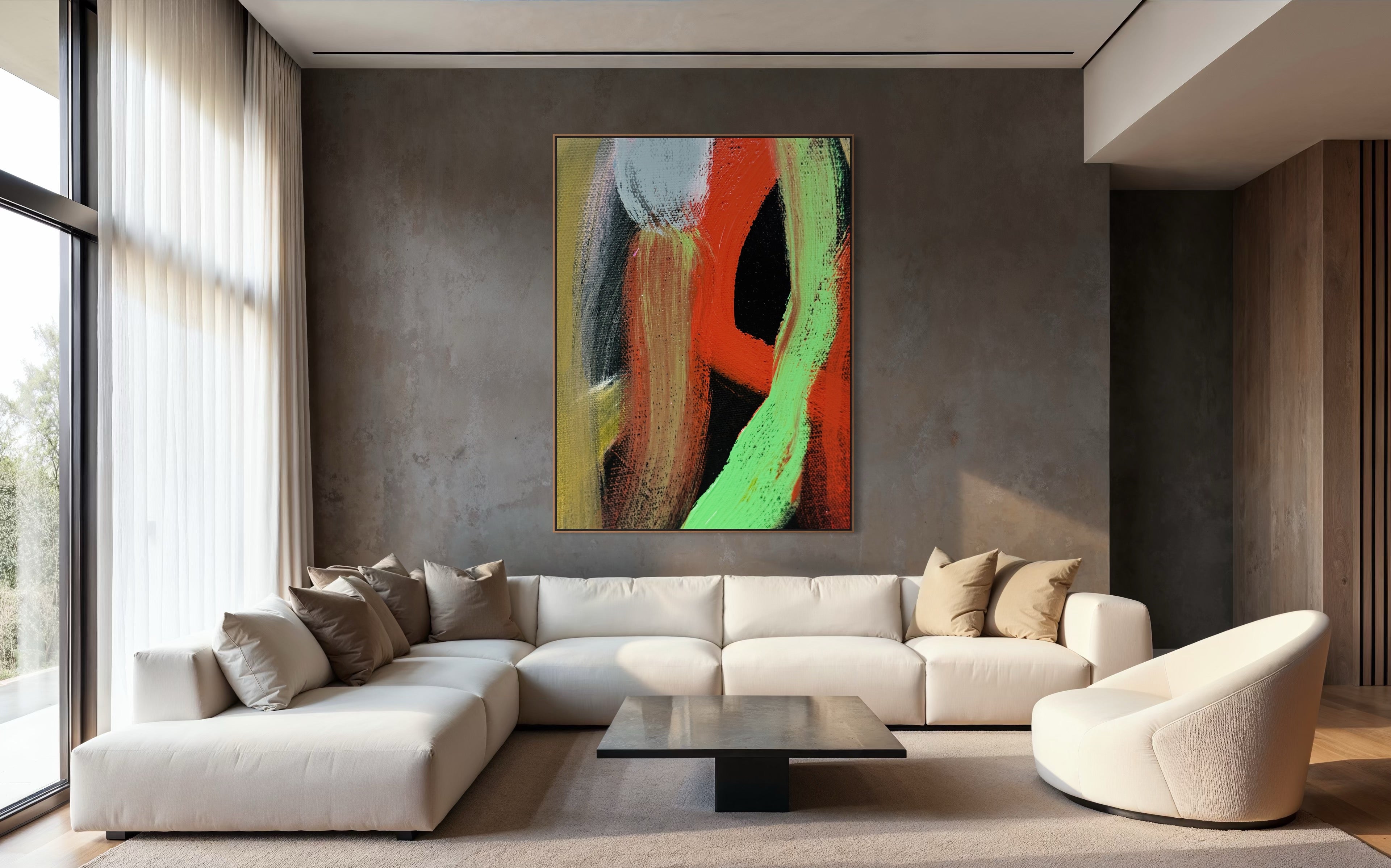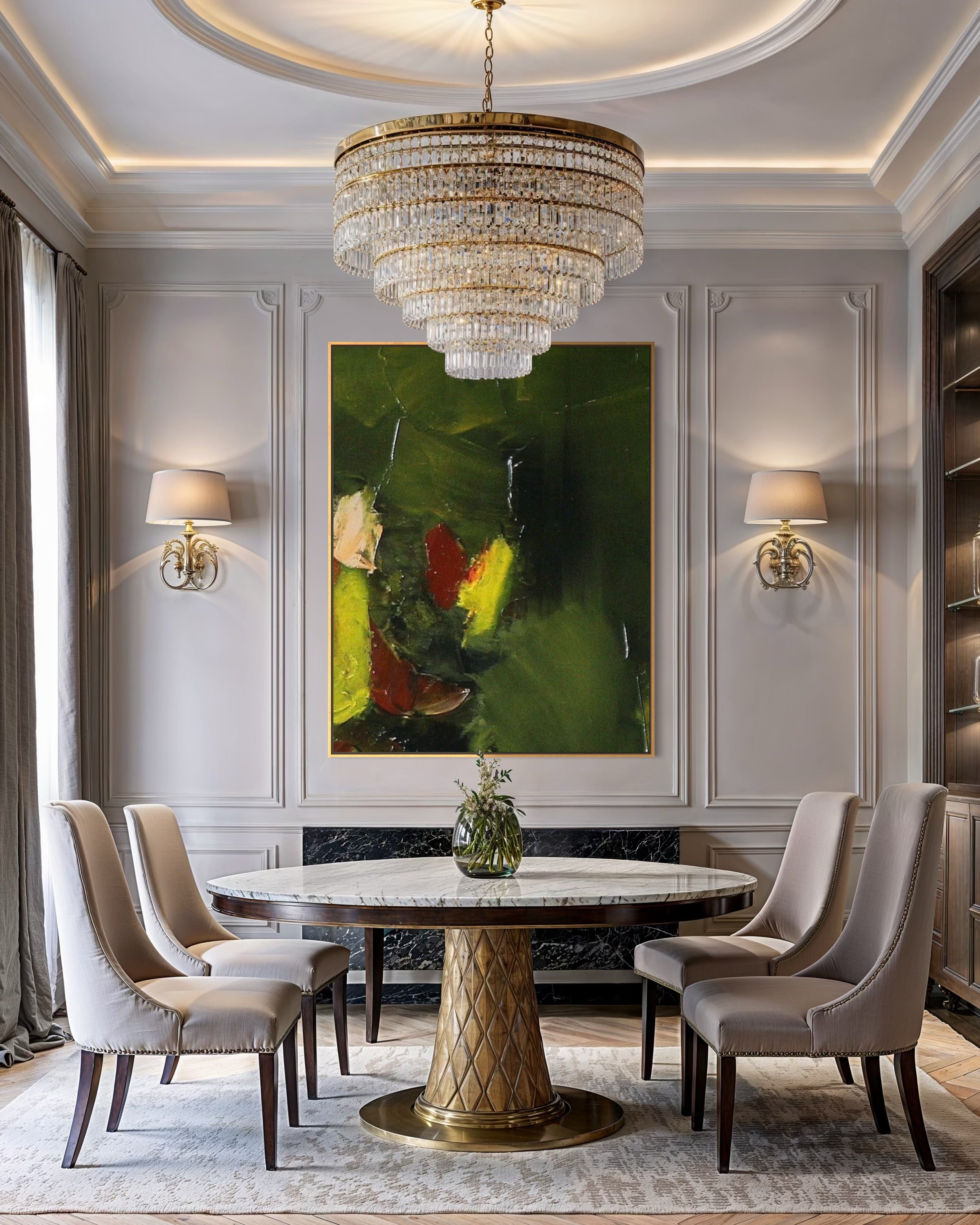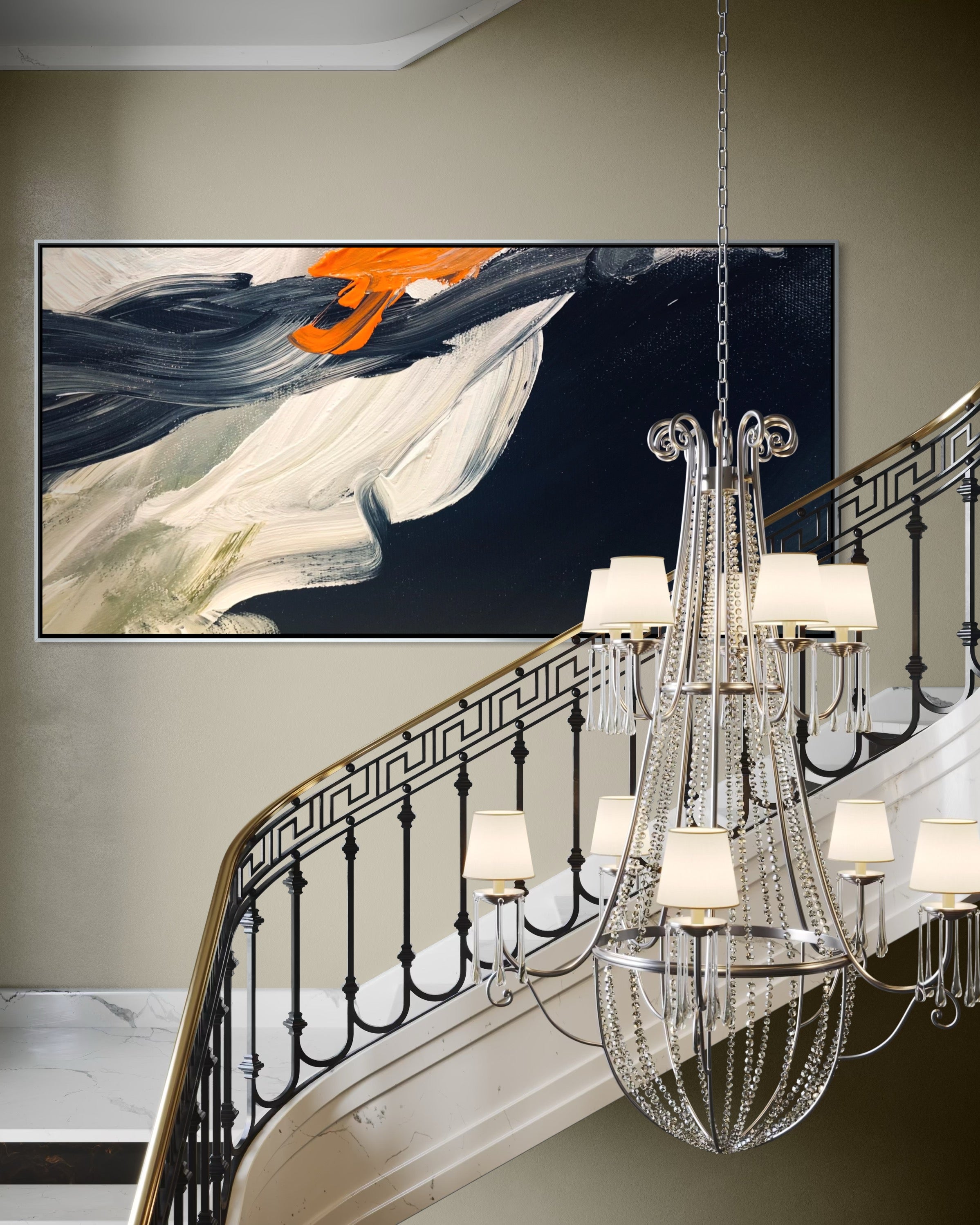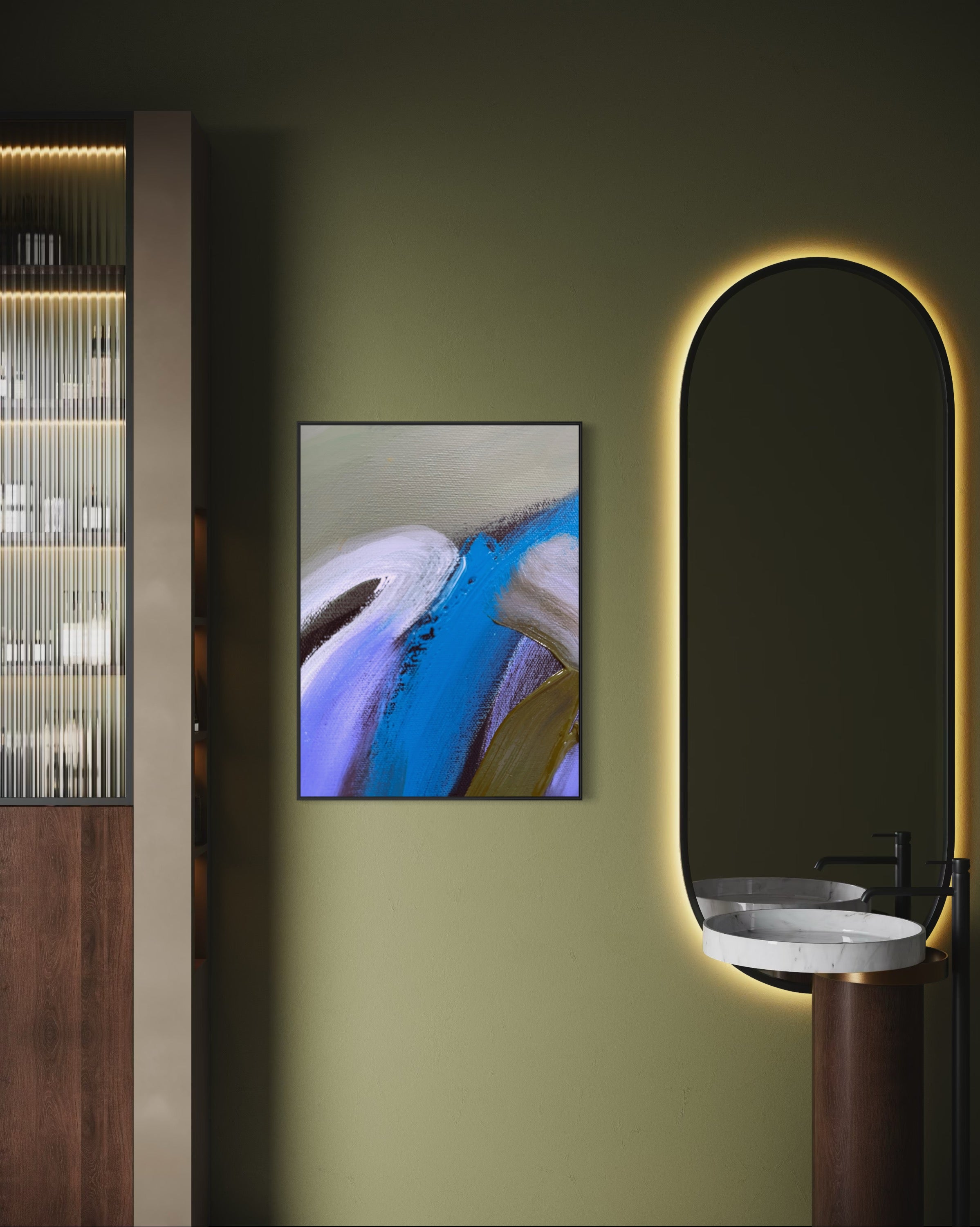 Curated artworks that balance cool greys and soft neutrals with warmth, movement, and timeless sophistication.