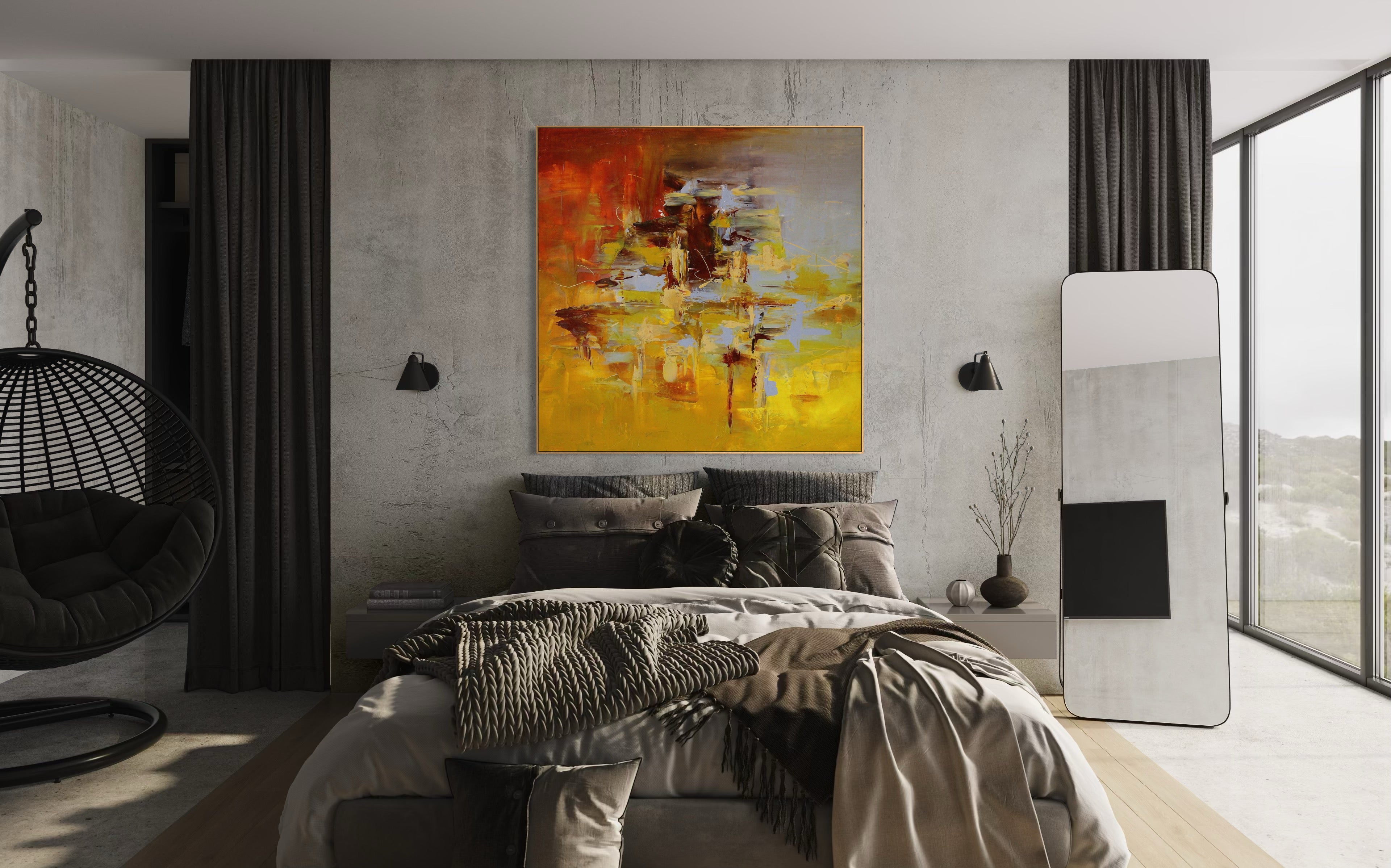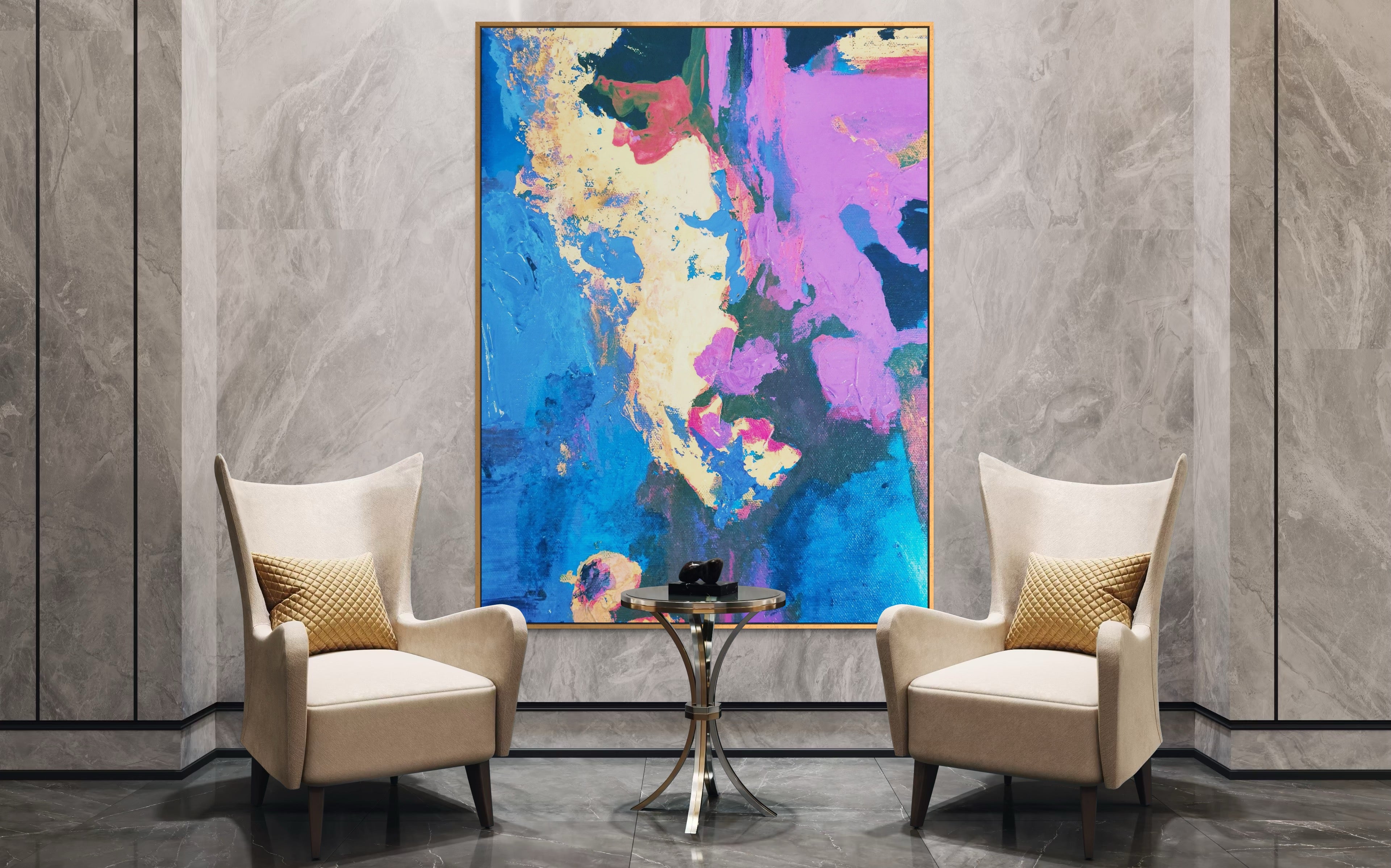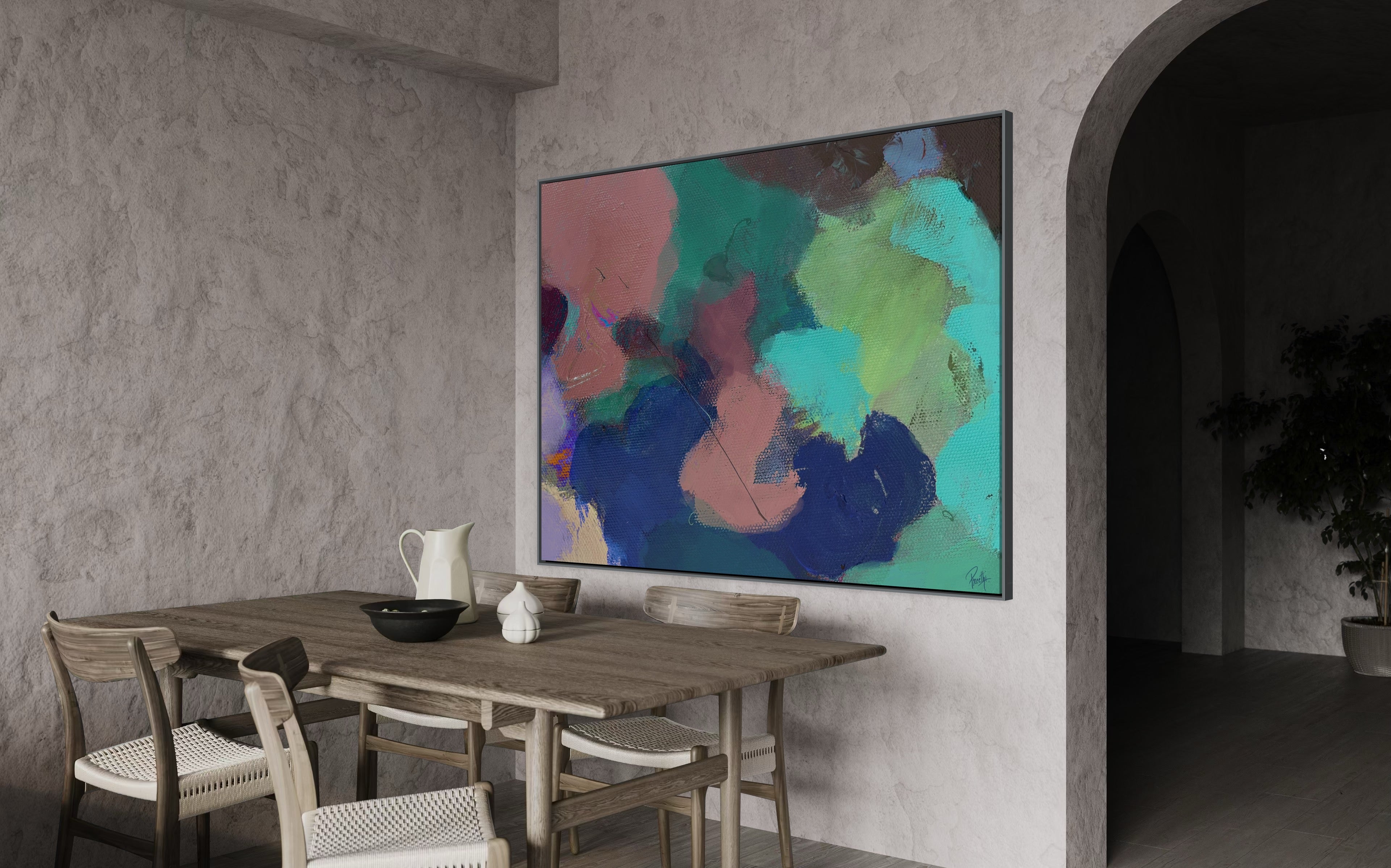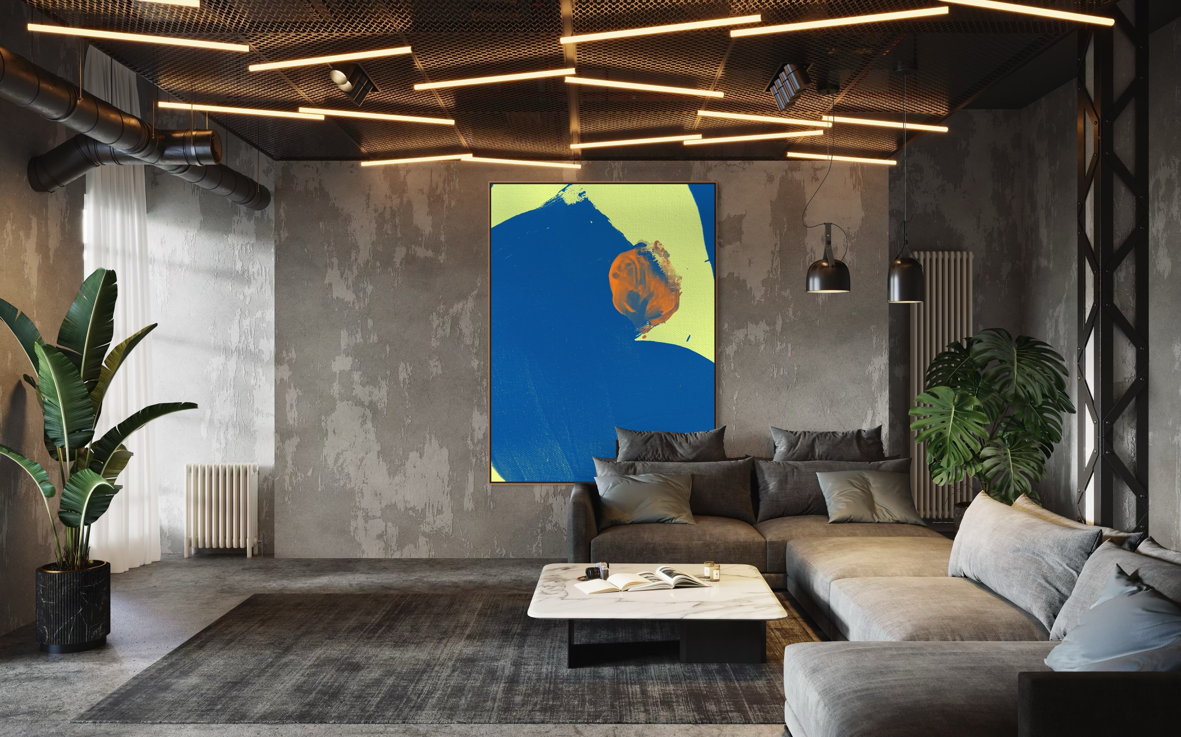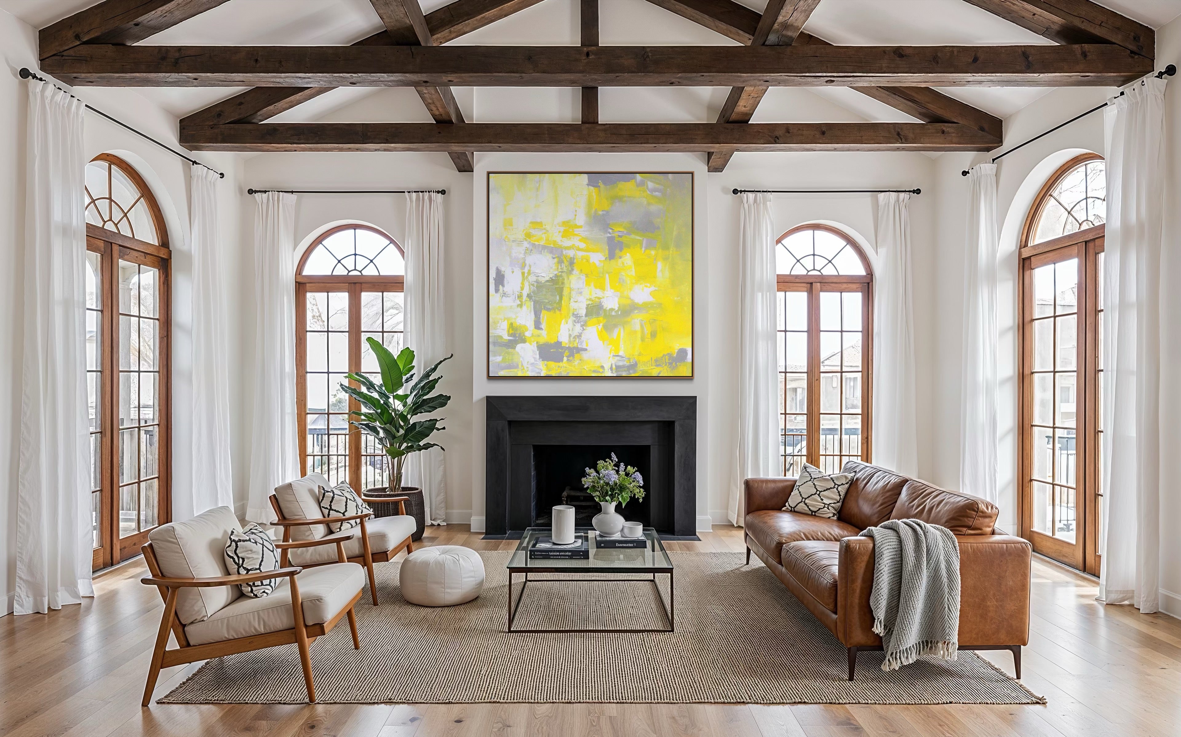 Curated artworks that balance cool greys and soft neutrals with warmth, movement, and timeless sophistication.