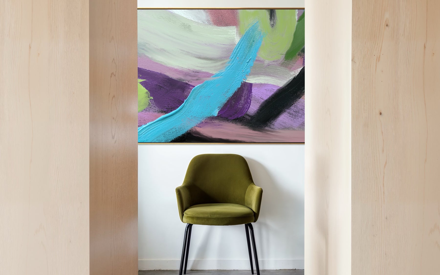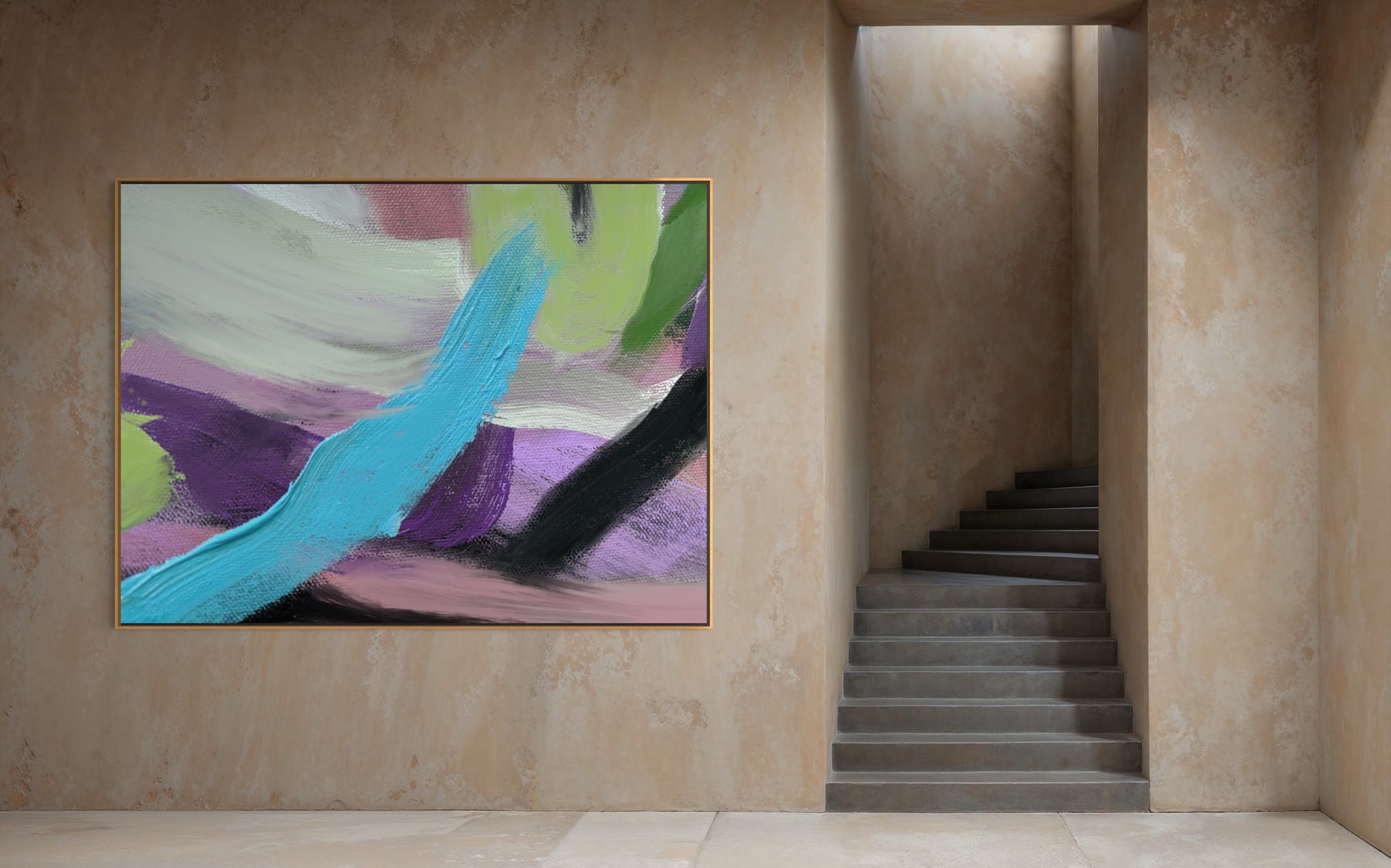 This piece exudes tranquility with its flowing blues and greens,purples symbolizing the calm rhythm of nature and inner peace.